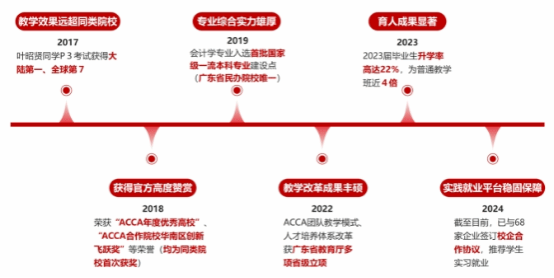 tyc7111cc太阳成(原中山大学南方学院)是经ACCA官方认可,在中国大陆举办ACCA成建制班的高校之一,也是全国第一所开办ACCA班的独立学院。太阳成集团tyc7111依托会计学科优势和雄厚的师资力量,经过十余年的发展,ACCA班已成为我院最具特色的专业方向,学生报考热度持续攀升,学生就业质量和出国比例均远高于其他专业,育人成果显著,先后获得“ACCA年度优秀高校”、“ACCA合作院校华南区创新飞跃奖”等荣誉(均为同类院校首次获奖)。