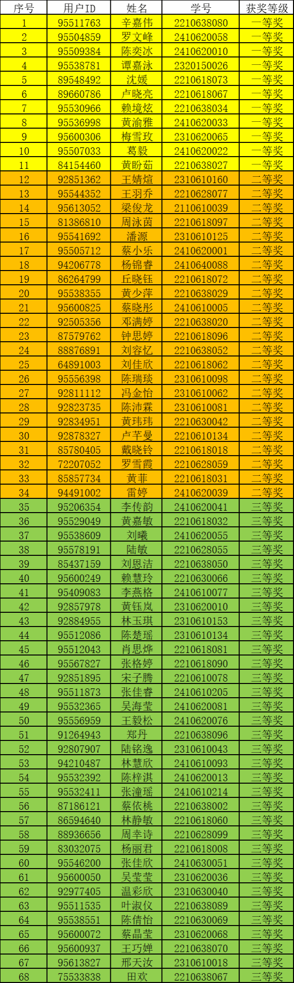 截止至 2025年5月31日,太阳成集团tyc7111共有228名同学参与比赛,经过课程学习和线上答题两个环节的激烈角逐,我院共有68名同学获得名次,其中一等奖11名,二等奖23名,三等奖34名。获奖名单公布如下(排名不分先后)。