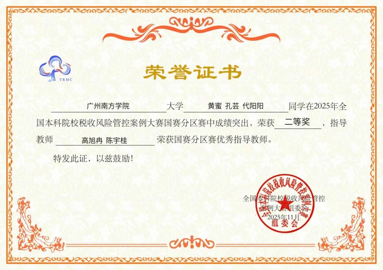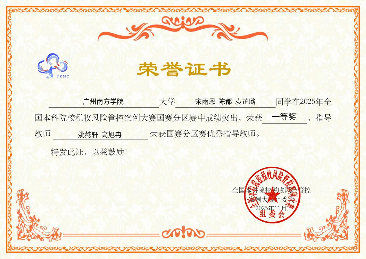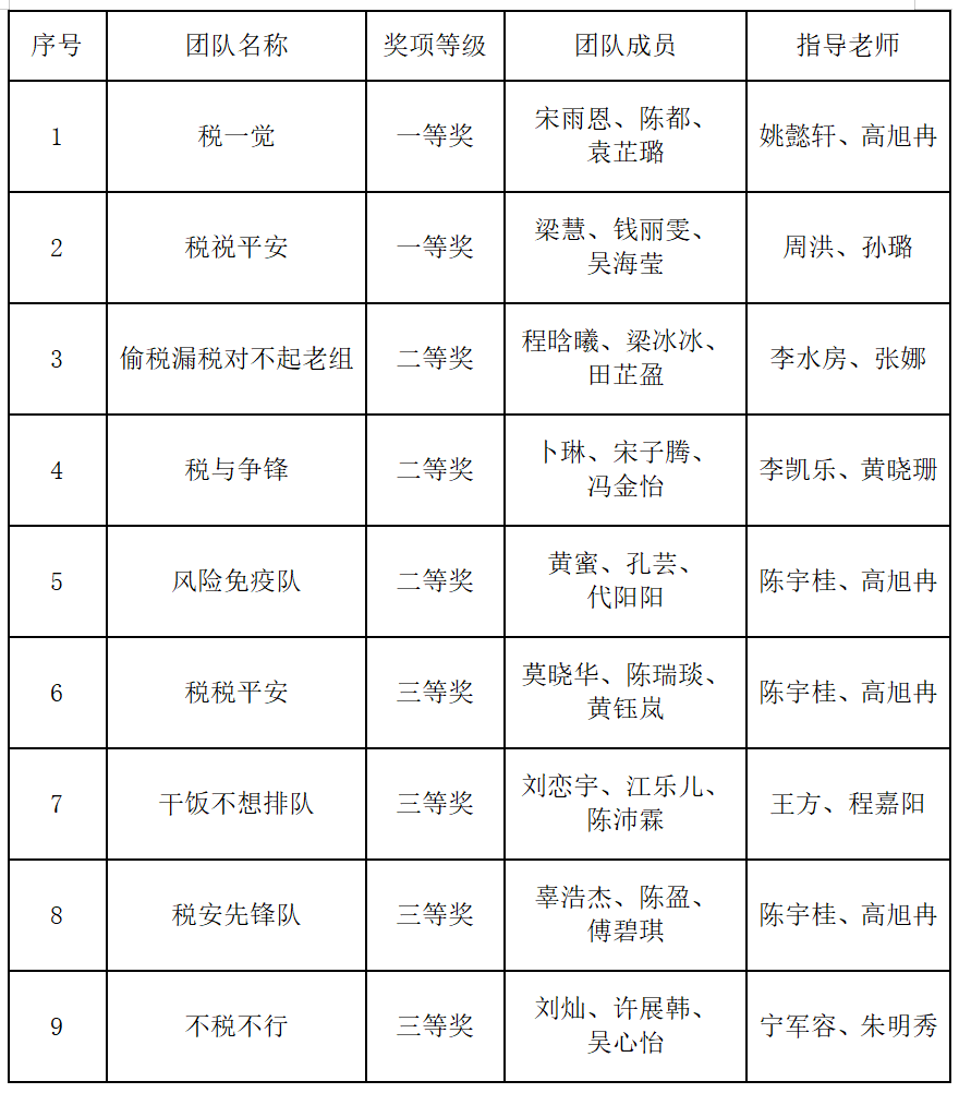 本次分区赛以原创税收风险管控案例为核心,聚焦制造业、金融业等十大行业的涉税风险分析与防控方案设计。广东赛区竞争激烈,我们学院9支队伍脱颖而出,荣获一等奖2项、二等奖3项、三等奖4项!其中,由姚懿轩和高旭冉老师指导的团队“税一觉”凭借优异表现,成功晋级全国总决赛!这不仅是对同学们专业能力和团队协作的肯定,更是太阳成集团tyc7111财税专业教学改革成果的生动展示。让我们共同揭晓本次大赛的获奖名单: