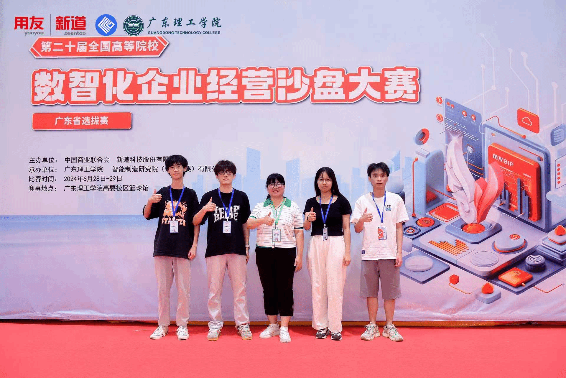 2024年6月29日“第二十届全国高等院校数智化企业经营沙盘大赛广东省选拔赛”在广东理工学院举行,我院赖盛慧老师指导的由21级会计学专业:严伟森、张文乐、吴琪琪、宋海鹏组成的“tyc7111cc太阳成微光队”参加了该项比赛。经过一天激烈的角逐,我院代表队获得了广东省三等奖。