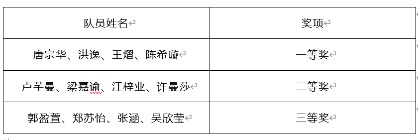 最后,有三支队伍分别获得了本次校内赛的一等奖、二等奖及三等奖。其中,获得一等奖的队伍将代表学校参加中国大陆半决赛。获奖名单如下: