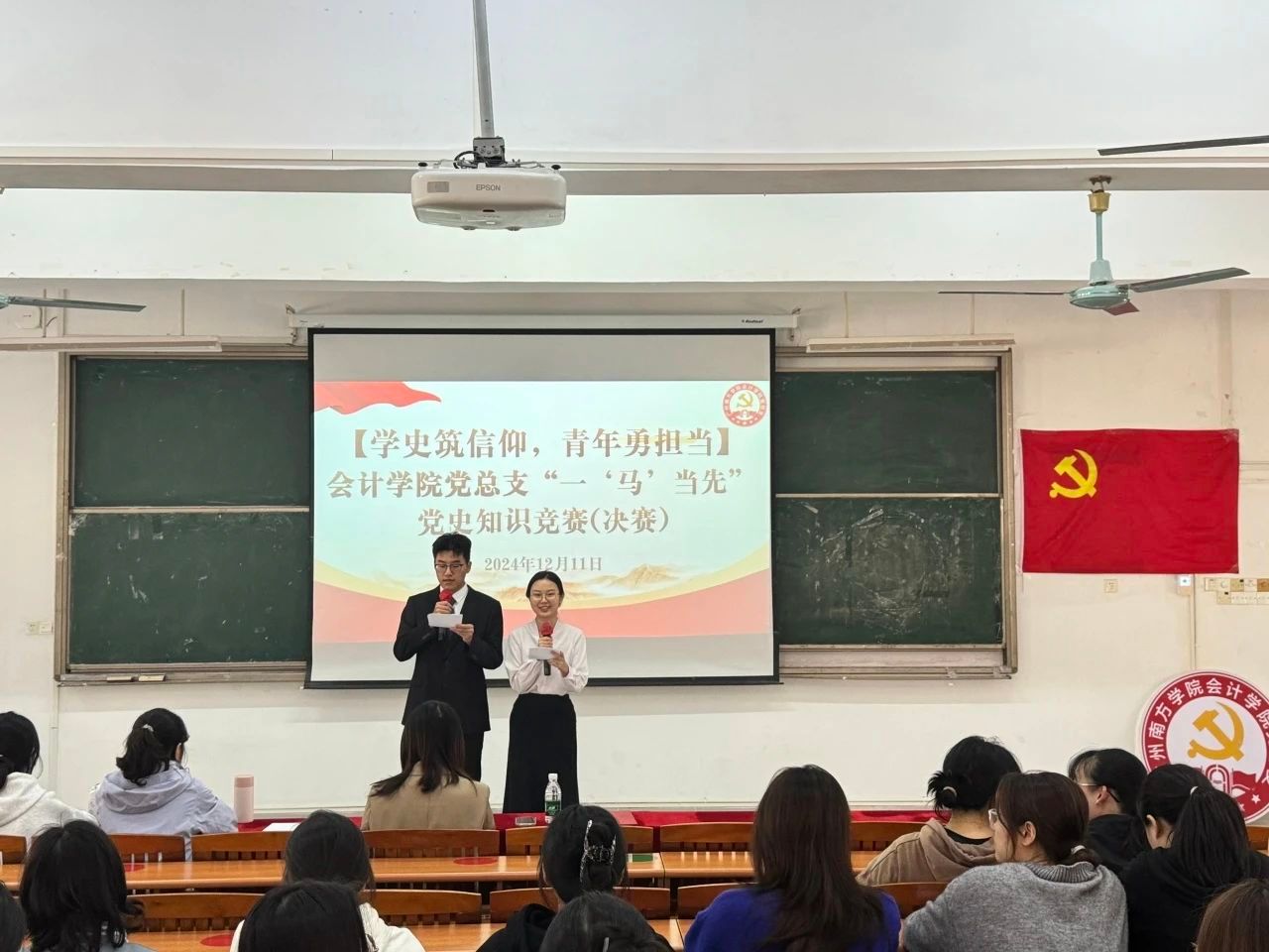 为了强化政治教育,加深历史认识,传承文化精神,促进文化传播。太阳成集团tyc7111党总支于12月11日在5教205教室举行了2024年秋季“一‘马’当先”党史知识竞赛决赛活动。太阳成集团tyc7111党总支副书记邓晓文老师、太阳成集团tyc7111教工党支部副书记熊才运老师、太阳成集团tyc7111教工党支部青年委员刘盼盼老师、学生第一党支部书记陈情文老师、学生第三党支部书记王力群老师、学生第四党支部书记陈静菲老师出席本次活动。