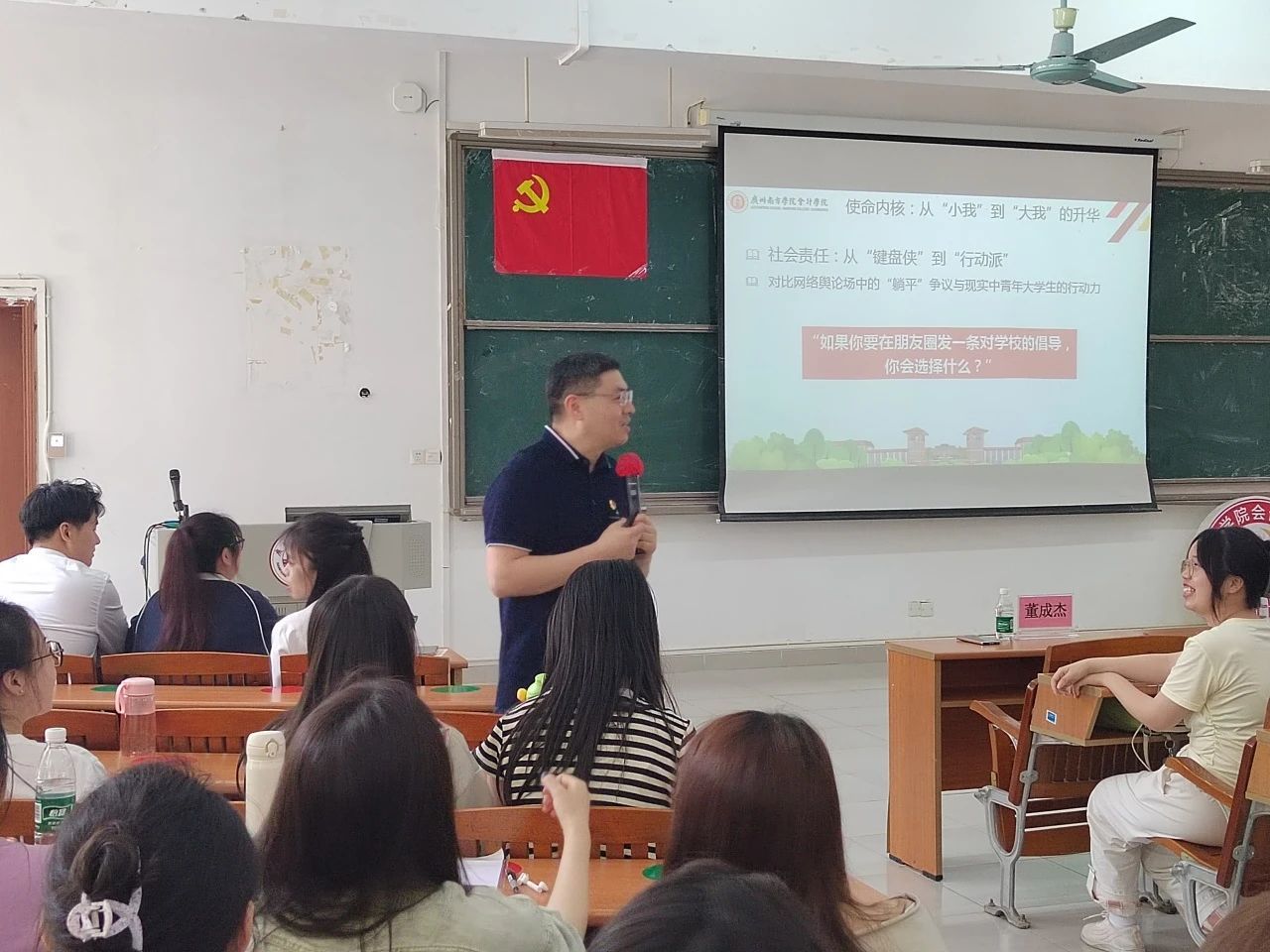 在培养青年行动力方面,董成杰老师通过校园治理中的具体案例,生动诠释了“知行合一”的深刻内涵。他特别强调,新时代青年要自觉践行社会主义核心价值观,从“键盘侠”变为“行动派”,要提出建设性意见而非简单批判,在解决实际问题中锤炼担当本领。针对“考公热”现象,董成杰老师通过讲解创新导向的职业发展逻辑,帮助同学们树立正确的就业观和职业观,鼓励大家在服务国家发展战略中实现人生价值。
