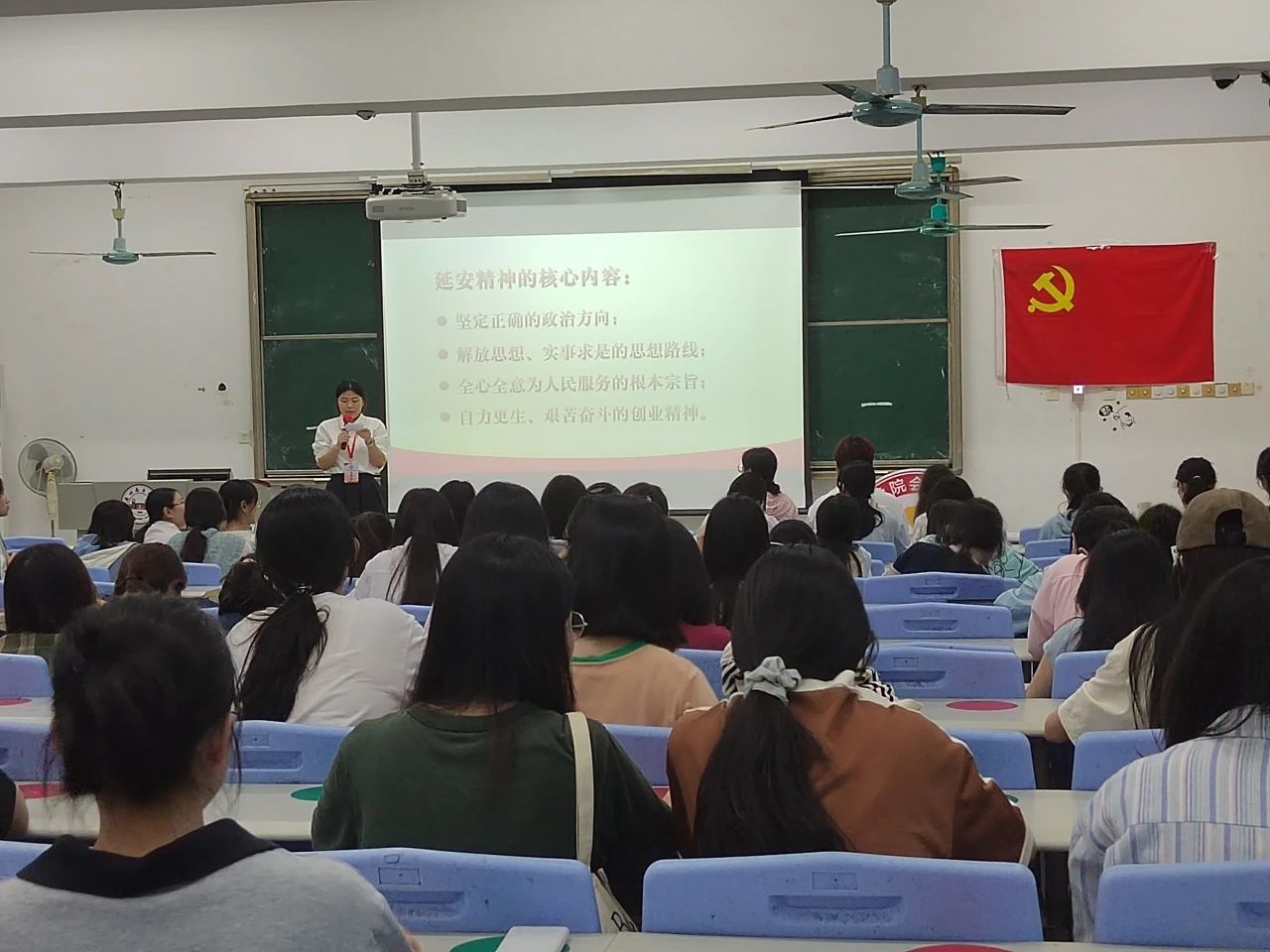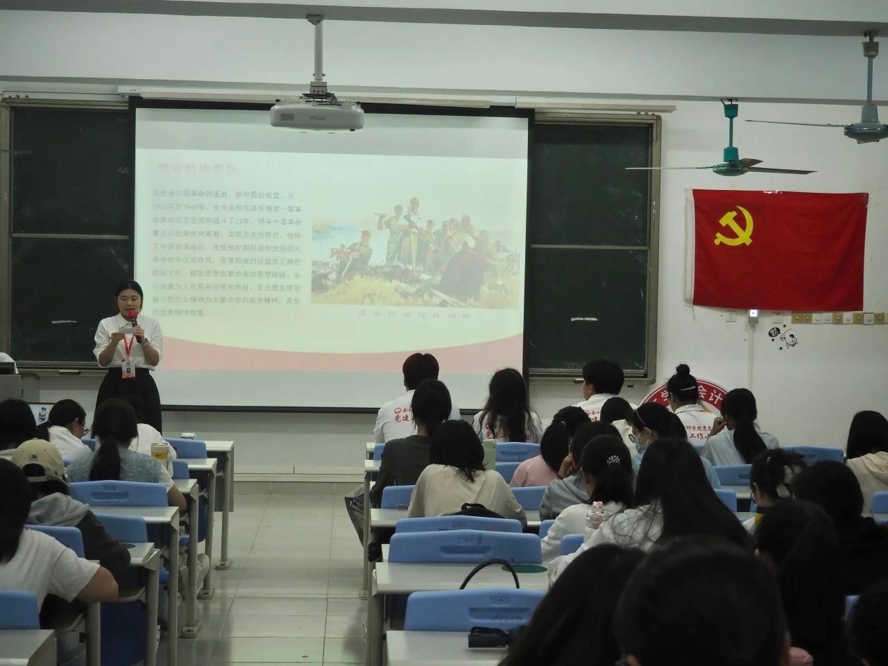 活动伊始,主持人带领同学们回顾了延安精神的背景。延安是中国革命的圣地、新中国的摇篮。延安时期孕育并传承的光荣传统和优良作风,特别是以“坚定正确的政治方向;解放思想、实事求是的思想路线;全心全意为人民服务的根本宗旨;自力更生艰苦奋斗的创业精神”为核心内涵的延安精神,不仅是中国共产党人精神谱系的重要组成部分,更是中国共产党在长期革命实践中积累的宝贵精神财富。