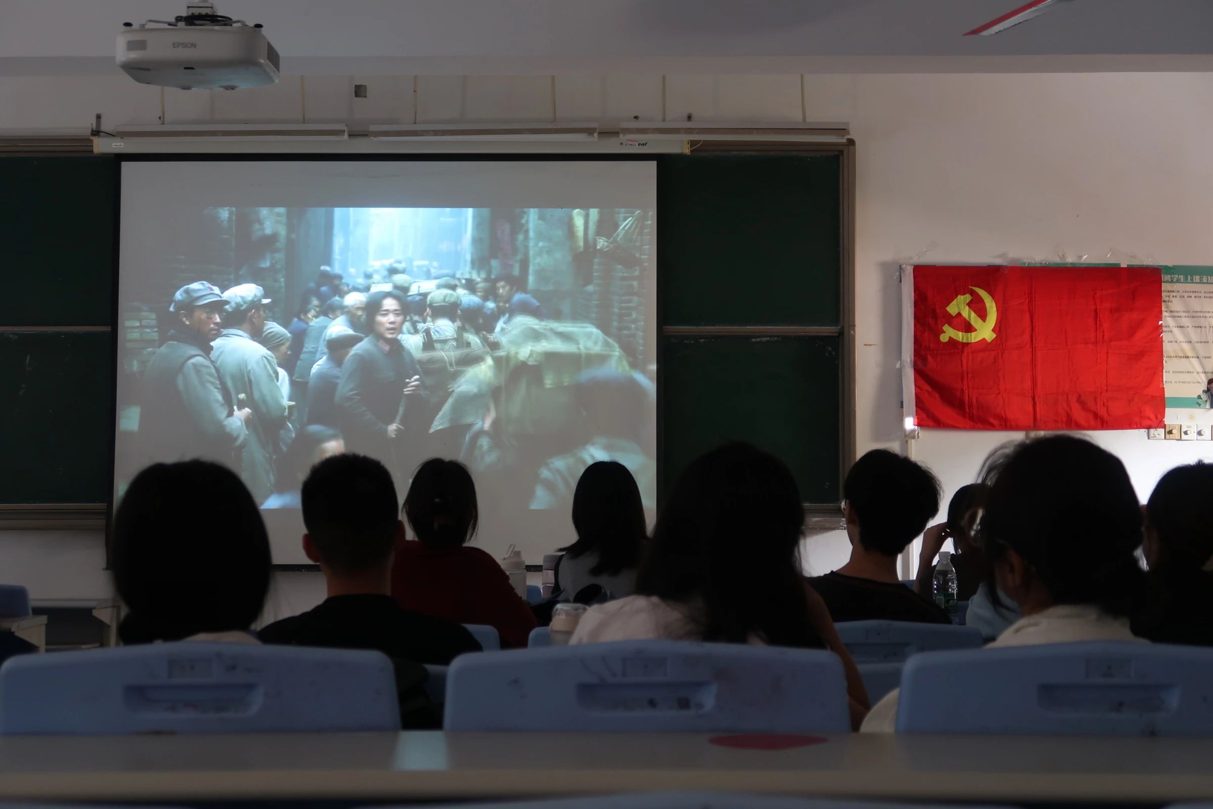 在合影留念之后,主持人紧接着引导在场的党员和入党积极分子一同观看了电影《血战湘江》,共同回顾和感受那段壮烈的历史。该电影以震撼的画面和感人至深的故事,生动再现了那段充满血与火的岁月。红军战士们不畏艰险、英勇斗争的精神,深深感染了每一位学生党员以及入党积极分子们。