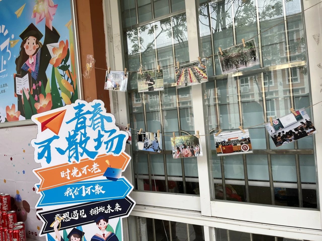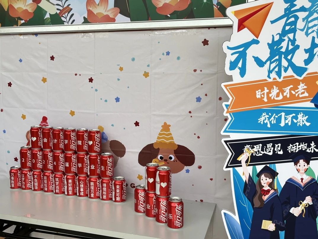 打卡点上摆放了定制标有祝福语的可乐,24届学子曾经的活动照片贴在了墙上。不止如此,泡泡机、手横幅、手持牌、打卡牌、立体盒子、立柱气球、手腕气球、风车、发箍等打卡道具提供给毕业生任意使用。