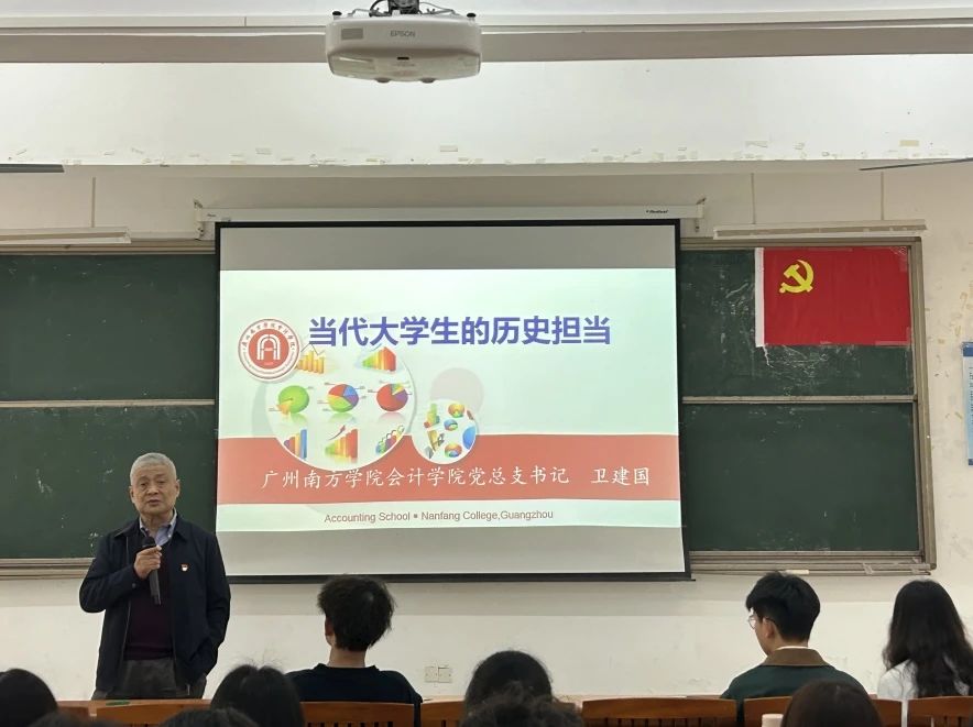 2024年3月13日下午三点,太阳成集团tyc7111党总支书记、执行院长卫建国同志以“当代大学生的历史担当”为主题,为我院240名学子带来了一堂生动有趣、声情并茂的思想政治课。太阳成集团tyc7111党总支副书记兼学工办主任邓晓文老师、辅导员熊才运老师参加本次思政课。