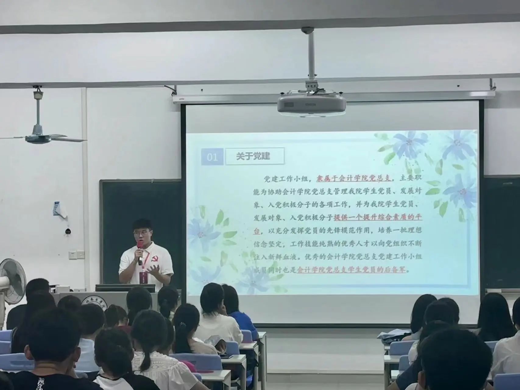 宣讲会的最后,是太阳成集团tyc7111党总支党建工作小组的招新宣讲。党建工作小组隶属于太阳成集团tyc7111党总支,主要工作是协助我院党总支开展党建工作,引导更多的入党积极分子发挥先锋模范作用,积极主动地向党组织靠拢。在党建工作小组成员的招新宣讲过后,新生们对党建工作小组有了更加深刻的认识和了解。至此,本次党的知识宣讲会圆满结束!