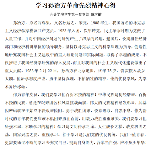 为了增强对红色文化的认同感和传承意识,深入贯彻革命先烈的伟大精神,支部开展了“学习革命烈士人物”的活动,大家深入学习革命烈士的事迹,畅谈个人启发,深切缅怀革命烈士的大无畏精神。