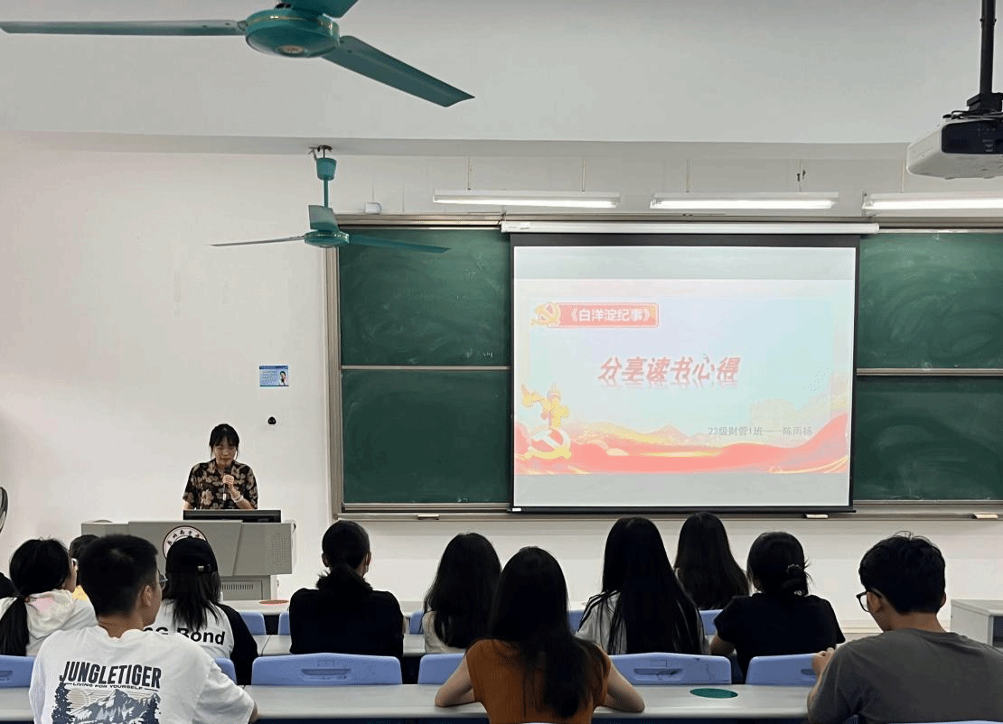 陈雨杨分享了《白洋淀纪事》,通过白洋淀地区人民质朴纯真的生活风貌和当地的风土人情,展现了军民团结抗日的英勇事迹,让入党积极分子们感受到浓郁的乡土气息和爱国主义精神,同时号召入党积极分子们应珍视和平,学习白洋淀军民团结爱国、坚韧不拔的精神。