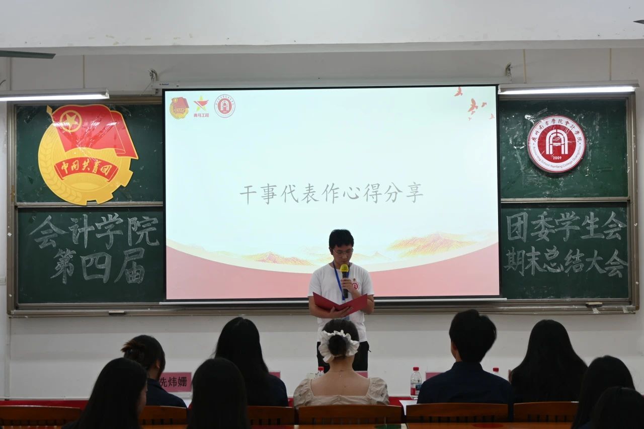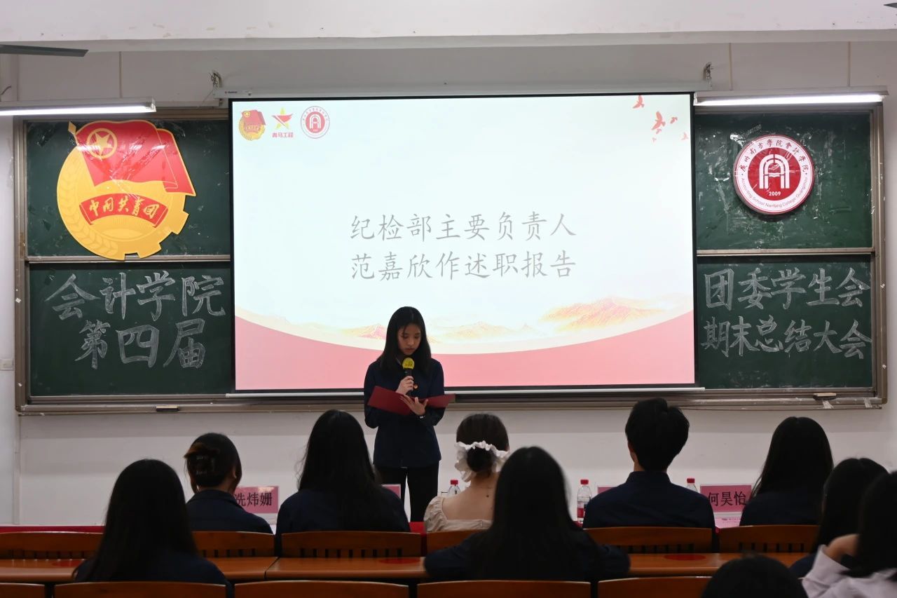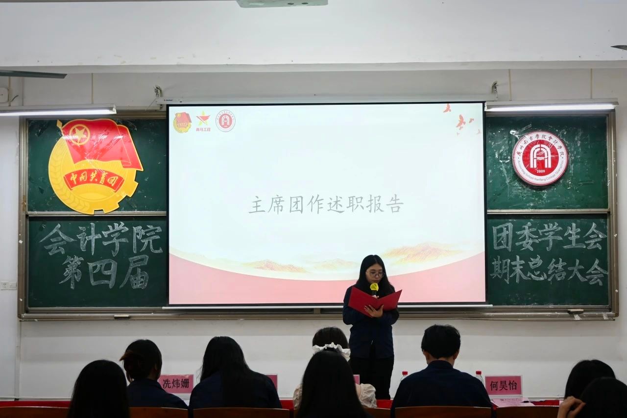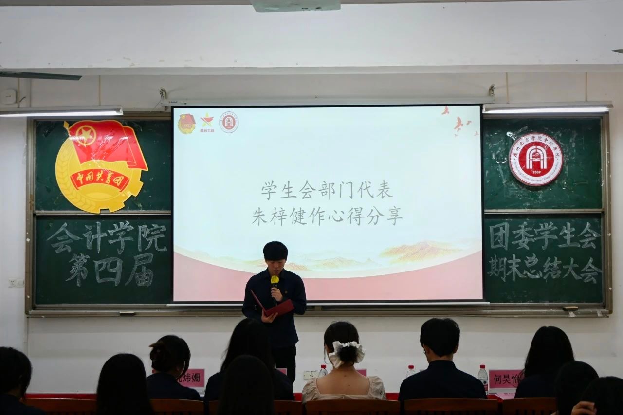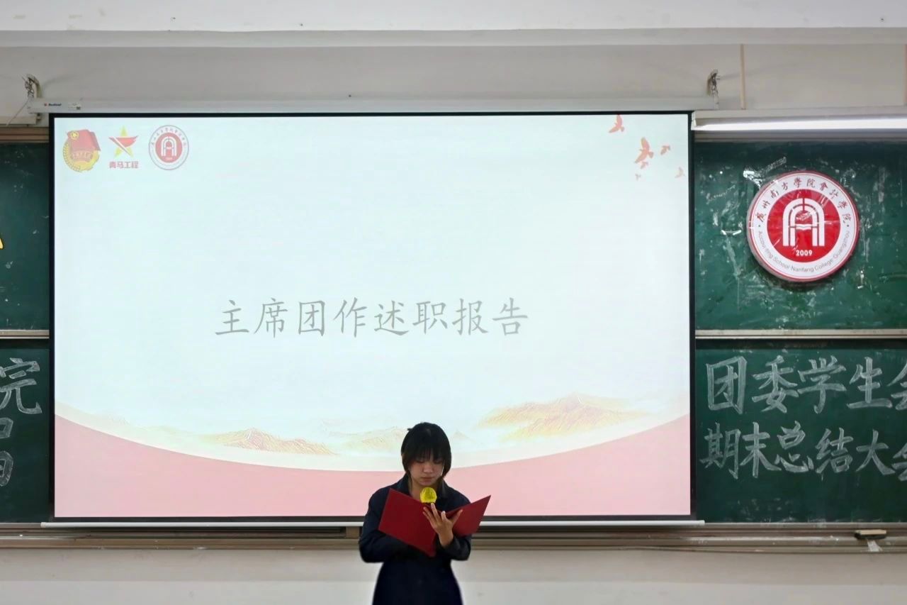 随后,团委学生兼职副书记刘灿、冼炜姗同学,学生会主席团成员黄兆恒、何昊怡同学依次上台,对本学年工作进行了总结。他们提到,团委学生会全体成员始终牢记初心,以“同学需求为导向”,在活动策划、学风建设、权益维护等方面取得了成绩。同时,他们也剖析了工作中存在的不足,如部门间沟通协调机制需进一步完善、创新性活动策划的多样性有待提升等。针对这些问题,各部门通过专题培训、经验分享、复盘优化等方式,推动团队不断成长蜕变,努力实现“服务有温度,工作有精度”的目标。