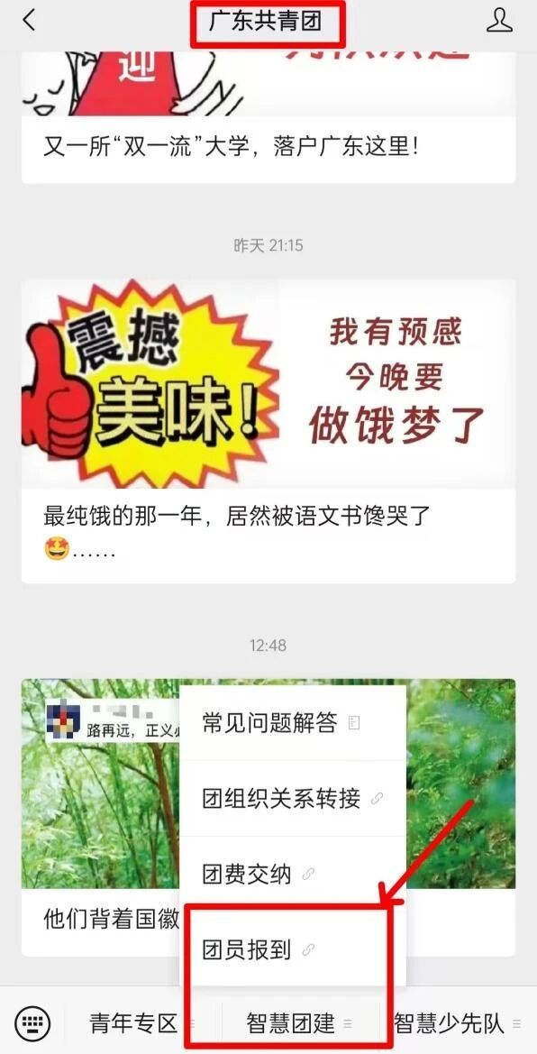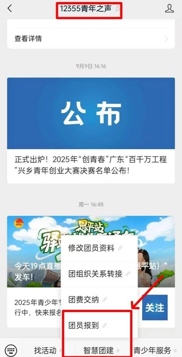 ①在微信公众号上搜索“广东共青团”或者“12355青年之声”,点击下方菜单栏“智慧团建”,随后再点击 “团组织关系转接”。
