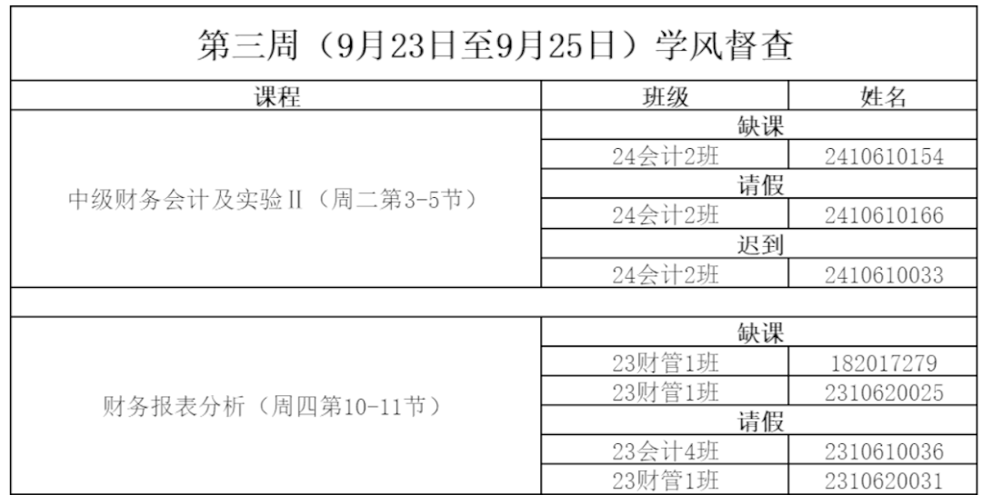 现将9月23日至9月25日(第三周)考勤情况公示如下: