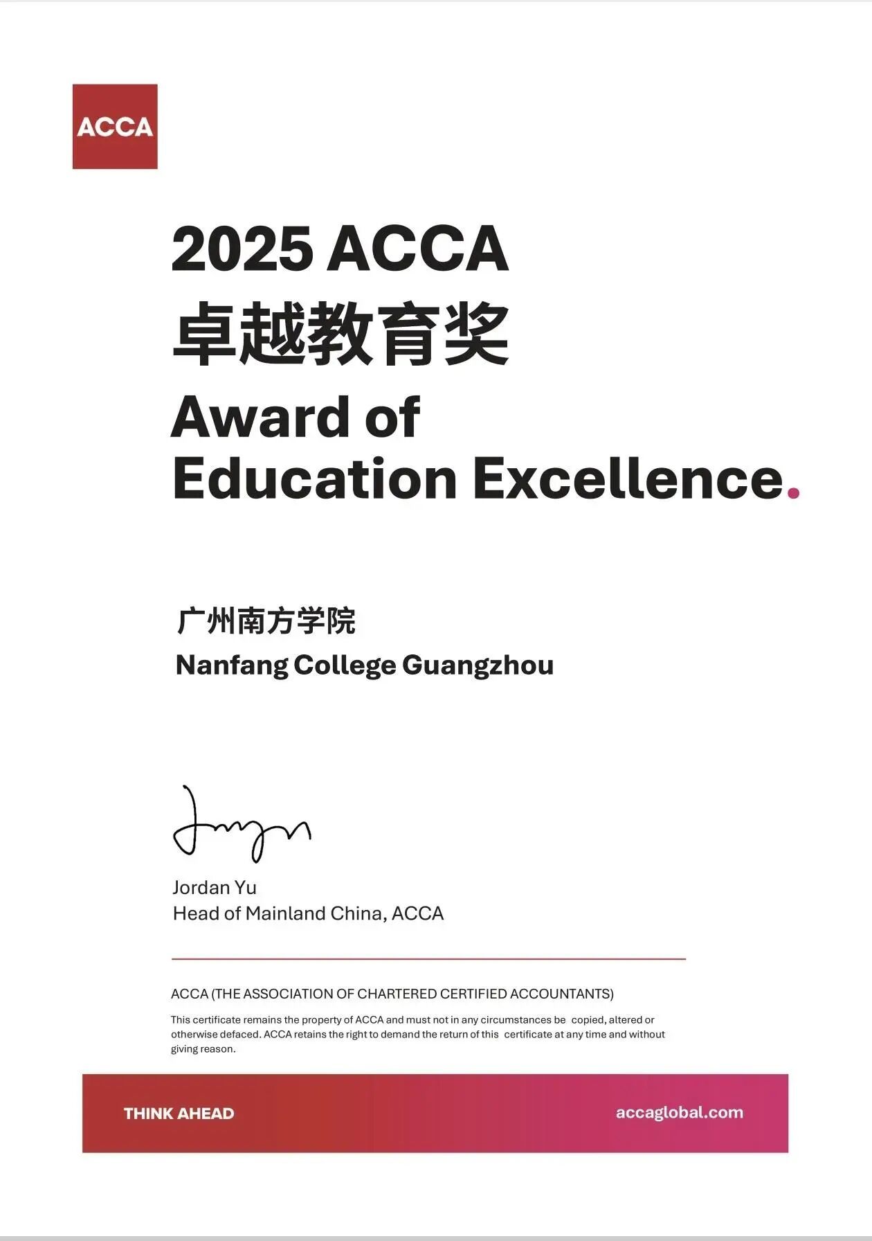 在备受瞩目的颁奖环节,我校荣膺2025年度“ACCA卓越教育奖”。该奖项旨在表彰通过ACCA方向班模式,在培养面向未来的复合型国际化人才方面作出重大贡献的院校。