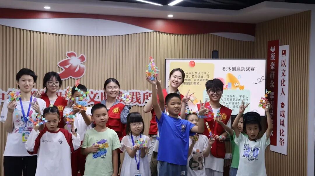 除了绘画,薪火筑梦团还准备了有趣的雪花积木让孩子们自行搭建。有的孩子将积木拼搭成造型独特的太空车,说要去探索宇宙;有的孩子将积木拼搭成轻便小巧的照相机,并举起来“咔嚓咔嚓” 拍照;还有的孩子把积木拼搭成精致典雅的皇冠,脸上洋溢着幸福与满足。团队成员在一旁仔细观察,时不时帮助孩子们调整积木的角度并稳固结构。大家一起分享搭建的灵感,整个服务站都沉浸在动手创造之中。