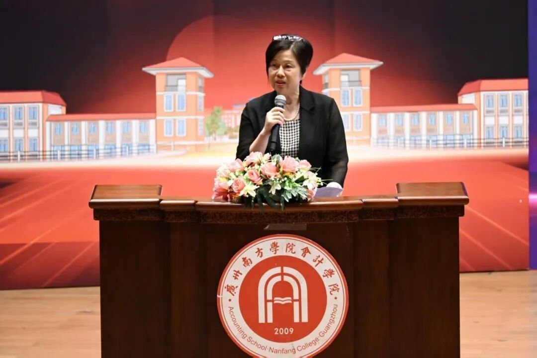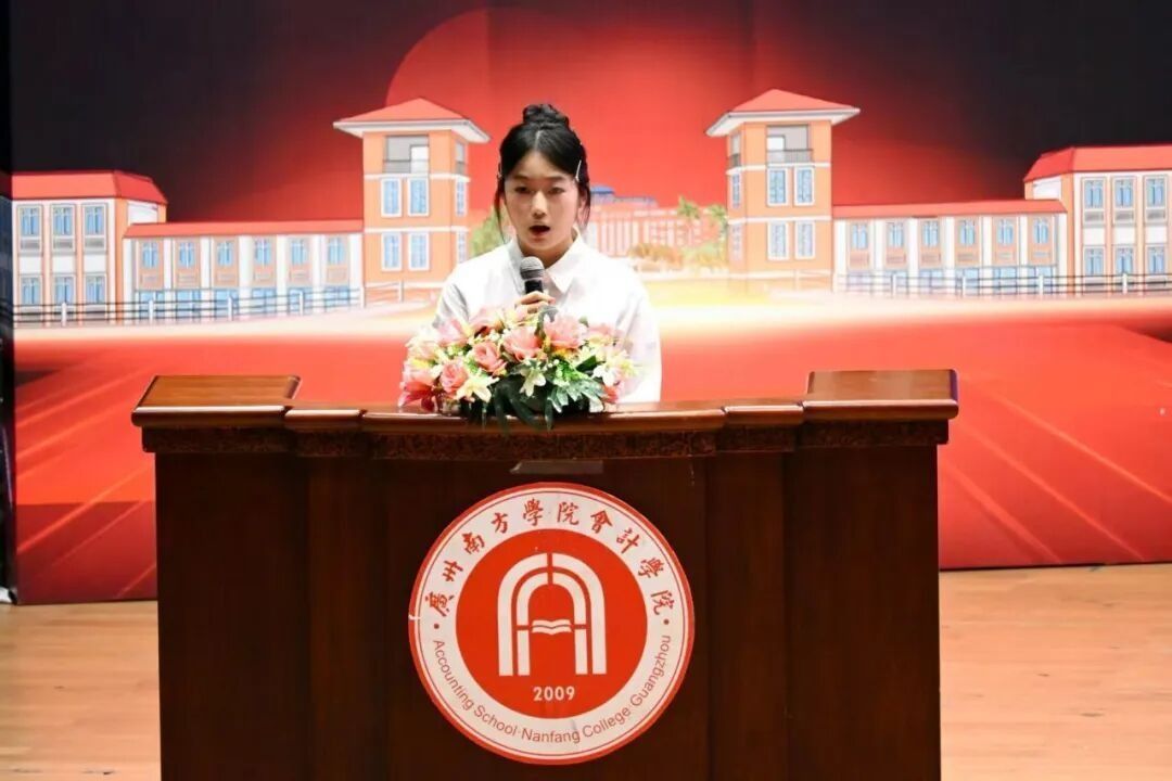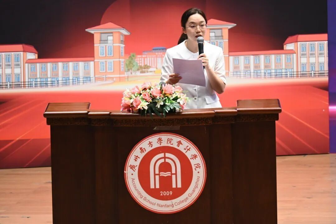 教师代表王艺璇老师勉励新生主动探索知识,积极参与社团、志愿与竞赛,学会在自由中权衡“机会成本”,忠于内心、勇于试错,为未来发展奠定基础。她用会计人的严谨与智慧寄语同学们,忘记过去,以“借方记付出、贷方记收获”的态度经营大学生活,书写无悔青春。