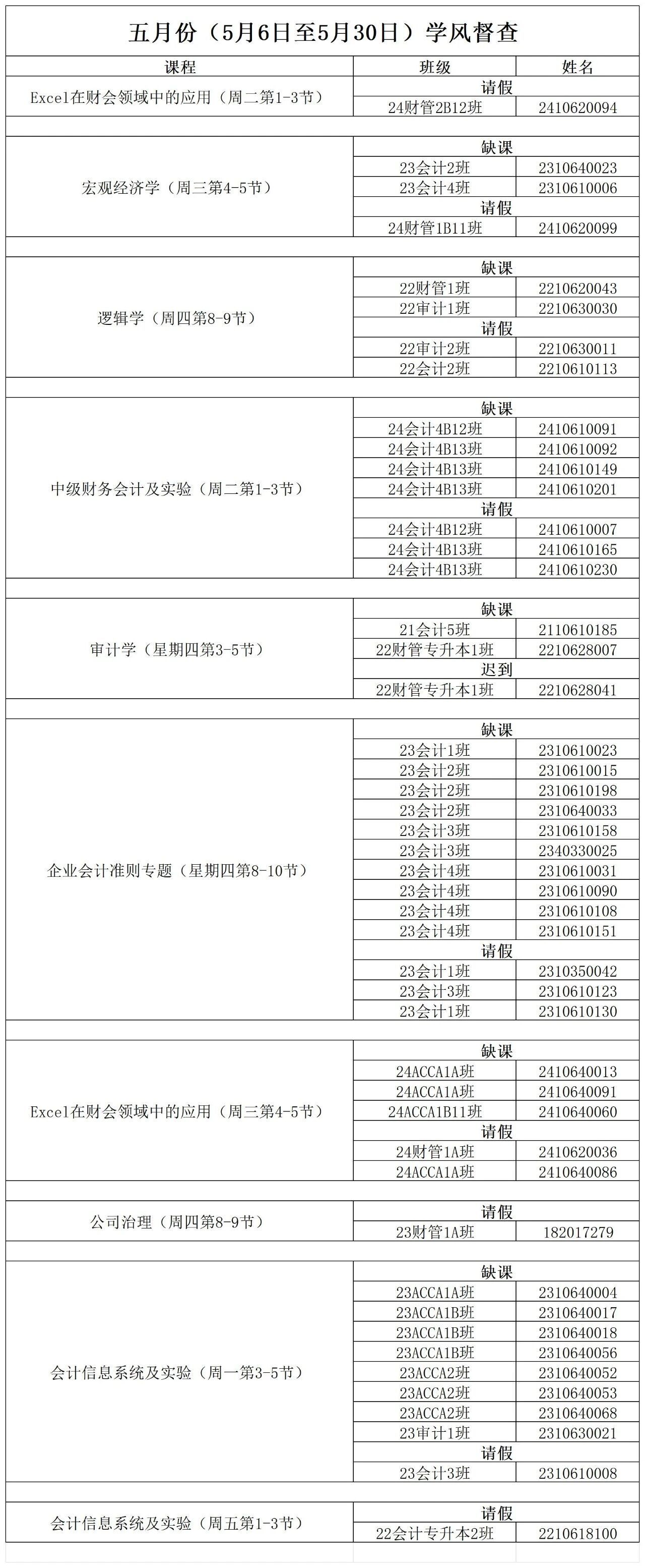 现将5月6日至5月30日(第十一周——第十四周)考勤情况公示如下: