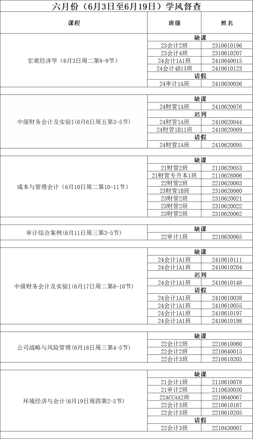 现将6月3日至6月19日(第十五周—第十七周)考勤情况公示如下: