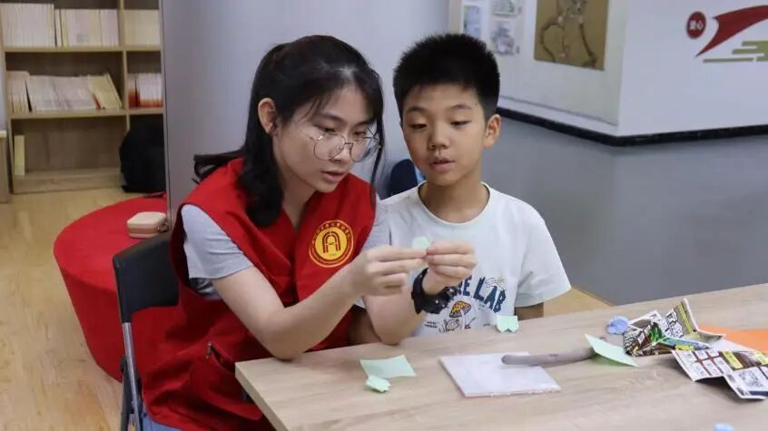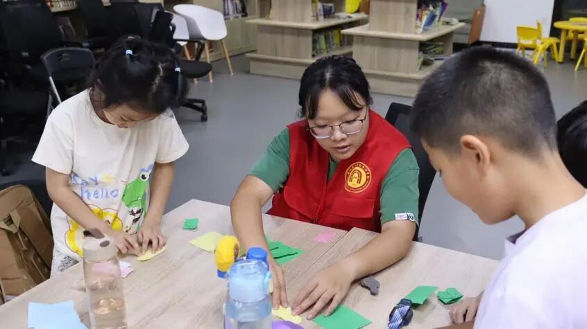 课程伊始,队员们将五彩斑斓的彩纸分发给孩子们,指尖翻动间,耐心演示着四叶草的折法,纸张的沙沙声与轻柔的讲解声交织成温馨的旋律。而孩子们紧随其后模仿,小手轻捏纸边,反复调整角度以做出四叶草的最好模样。