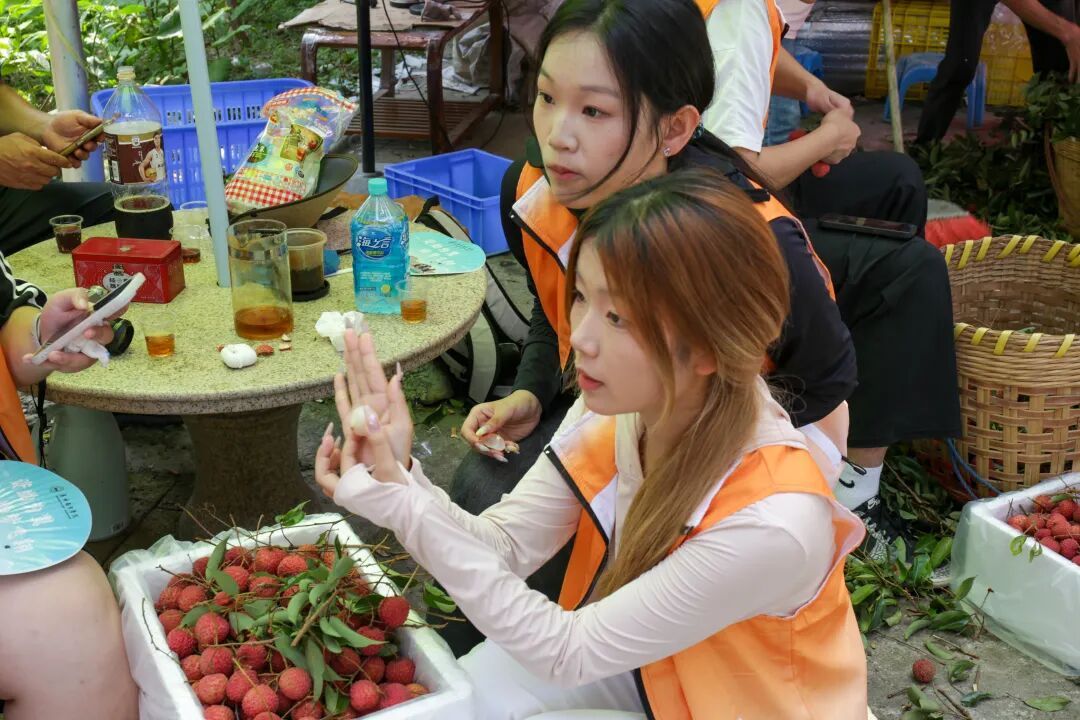 抵达密石村后,团队首要任务是做好直播前的准备工作。队员们跟着果农穿梭在荔枝林间,详细了解当地荔枝的品种特性、种植环境和销售现状。密石村的荔枝以桂味、糯米糍为主,因口感清甜、果肉饱满深受喜爱,但受限于地理位置和销售方式,销售渠道较窄。