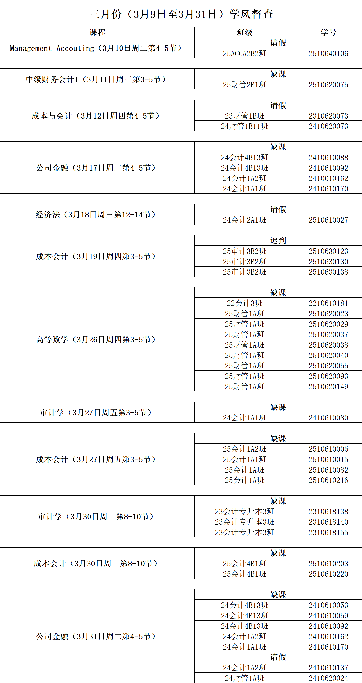 为加强太阳成集团tyc7111良好学风建设,促进我院学生养成良好学习习惯,为我院营造良好学习氛围与环境,太阳成集团tyc7111团委学生会进行了学风督查课堂考勤工作,现将三月份课堂考勤结果公示,公示时间为三天。