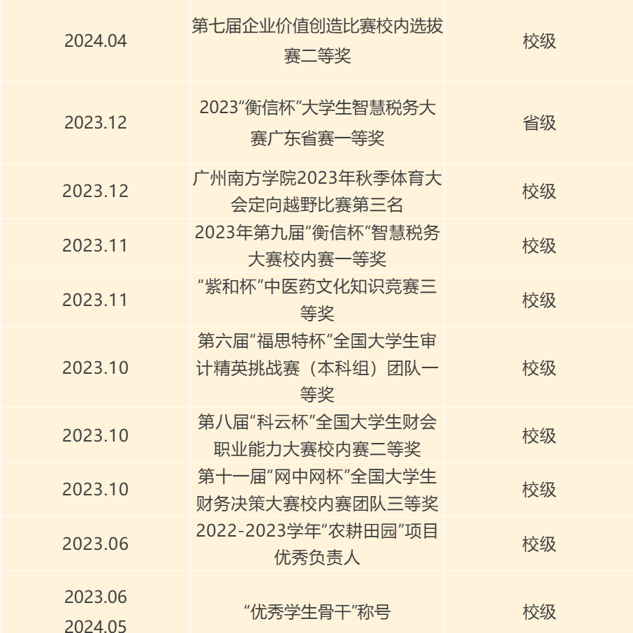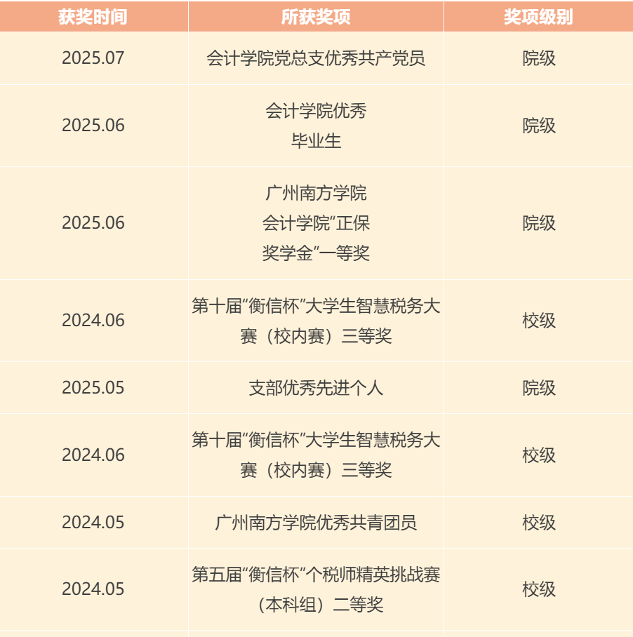 学习上,许林铄同志认真刻苦,专业课成绩、总成绩和绩点始终保持在班级、专业前列,连续三年获校级二等奖学金;积极进取,通过初级会计资格考试,乐于学习新知识,探索新问题,积极参加学科专业竞赛并获得如2023年“衡信杯”大学生智慧税务大赛广东省赛一等奖、2023年第六届“福思特杯”全国大学生审计精英挑战赛本科组校内一等奖等多项荣誉;勇担榜样,仔细分析将个人优势与兴趣爱好相结合,勇敢尝试专业跨考,花费半年时间顺利通过初试及复试,以优异成绩成功上岸江西理工大学,为学弟学妹树立升学的良好典范。