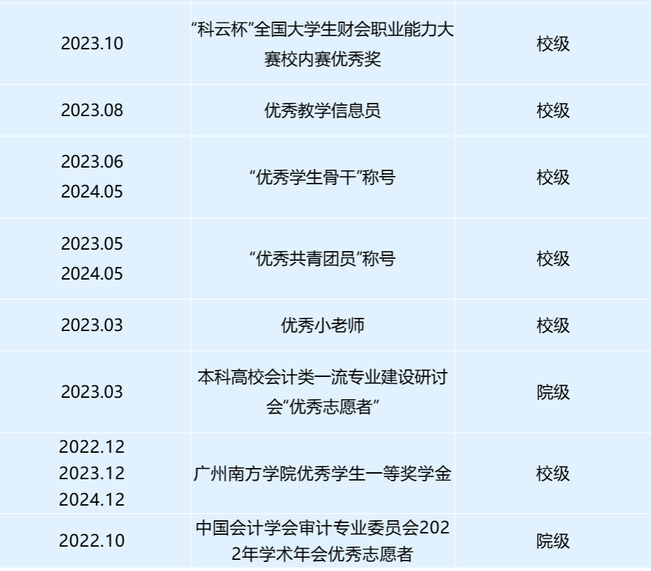 “今朝苦心孤诣,明朝化蛹为蝶”。在学习方面,蔡婉仪同志始终严格要求自己,态度端正。综测排名每年都是专业第一,三次评选奖学金都获得了一等奖。在考证方面,考取了初级会计职称证书、教师资格证、六级证书、计算机二级证书等各类证书,不断筑牢专业根基。