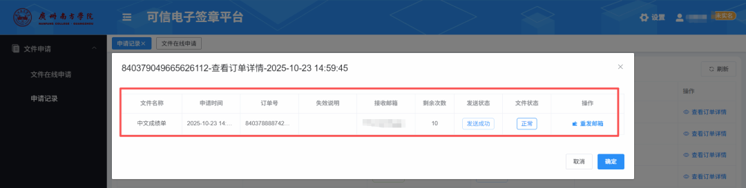 (3)申请记录:点击左侧导航栏“申请记录”选项卡,可查询文件的申请状态及订单详情,订单详情可看到发送是否成功,或通过订单记录再次下载此文件。