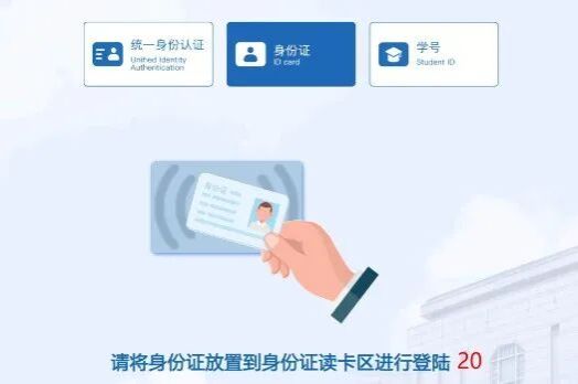 选择身份证登录方式,提示20秒内将身份证放置在身份证读卡区,验证成功后登录系统。