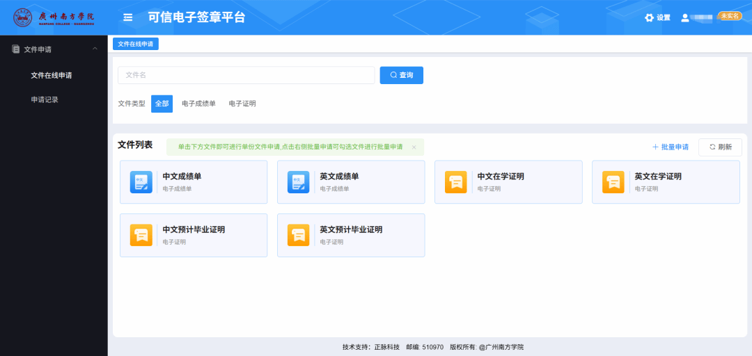 (1)下载电子成绩单&电子证明:登入成功后,点击左侧导航栏“文件在线申请”选项卡,选择所需要的文件。