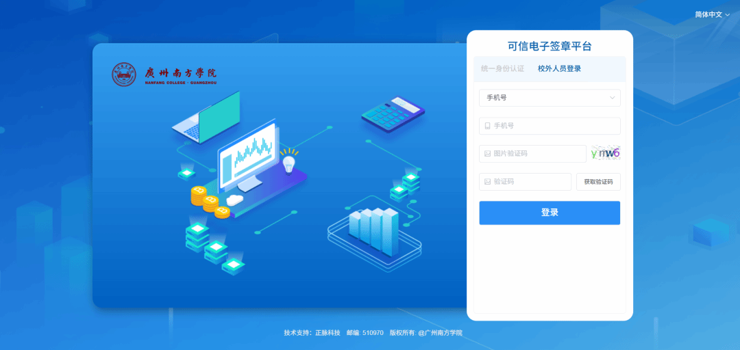 毕业生校友进入可信电子凭证服务平台PC端,选择校外人员登录,输入姓名,身份证号,手机号,手机验证码进行验证。