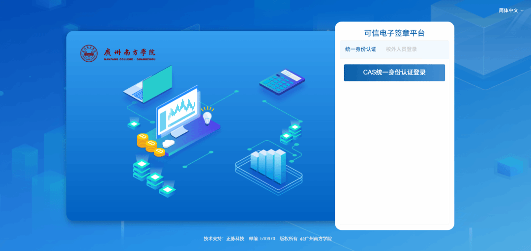 在校学生通过平台网址进入可信电子凭证服务平台PC端,选择统一身份认证登录。