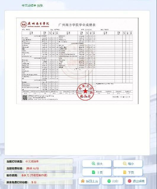 1.成绩单:根据《广东省物价局、广东省教育厅、广东省财政厅关于进一步规范我省高等学校收费管理的通知》(粤价〔2007〕186号)相关规定,学生在校期间和毕业时,可免费开具5份中英文成绩单,超过5份以及毕业离校后重新回校开具的纸质版成绩单按中文版每份20元、英文版每份40元标准收取。线上申请电子版成绩单不收取费用。