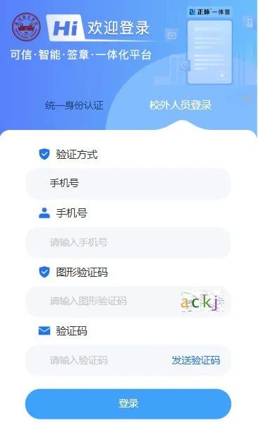 毕业生校友进入可信电子凭证服务平台手机端,选择校外人员登录,输入姓名、身份证号、手机号、手机验证码进行验证。