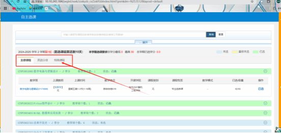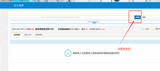 学生角色进入选课--自主选课页面,按照筛选条件选择符合所需的课程,系统默认展示主修课程页签,进入页面后点击查询按钮,查询课程,学生可切换至其他页签,查看其余类型课程,参考界面如下,点击这里切换标签: