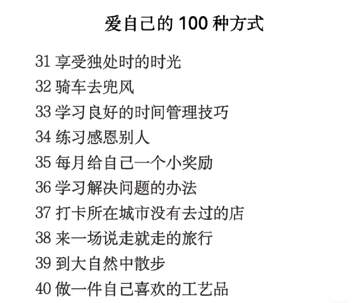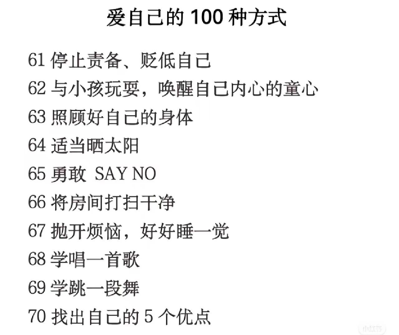 活动内容:依据下文中展示的《爱自己的100种方式》,完成相应的活动,可把活动过程拍成照片或视频,照片人物要清晰,符合要求可加1个成长学时。