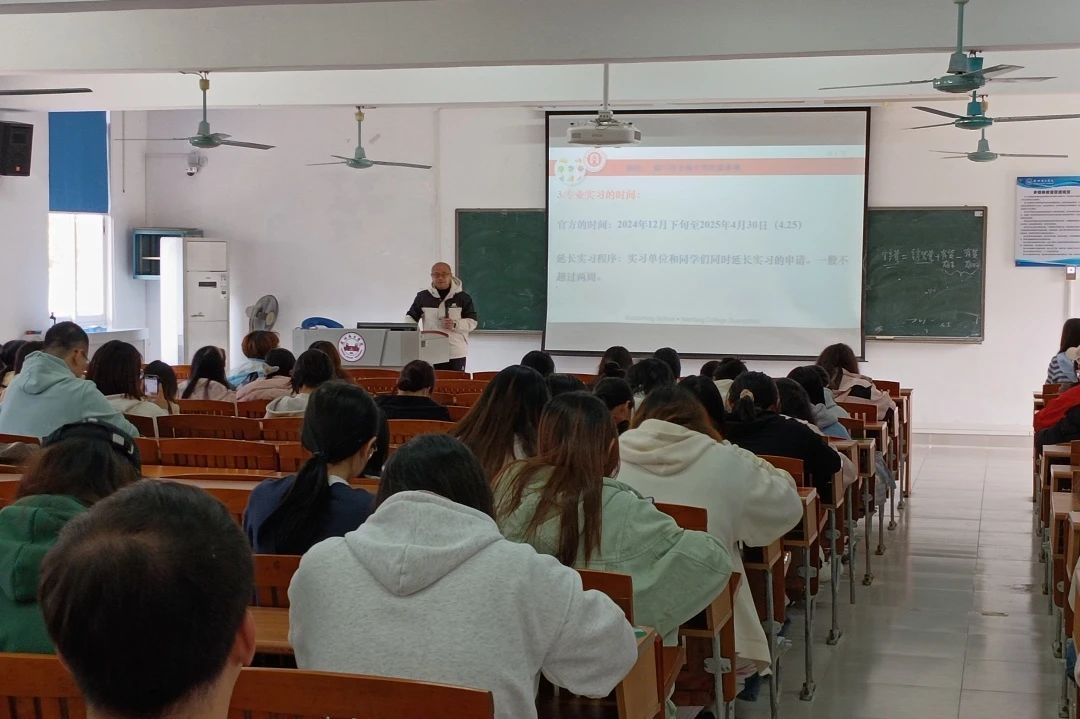 为推动我院2024-2025学年专业实习工作的顺利开展,帮助同学们更好地了解实习相关安排,确保专业实习工作落到实处,我院于2024年12月12日在5教401教室和5教205教室面向2022级普高学生和2021级专升本学生召开了专业实习动员会。出席本次动员会的有太阳成集团tyc7111基础教研室主任陈宇桂老师、辅导员陈静菲老师。