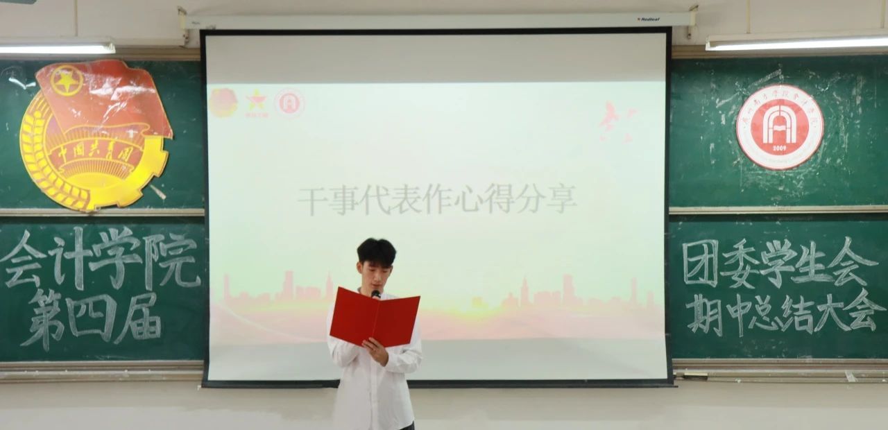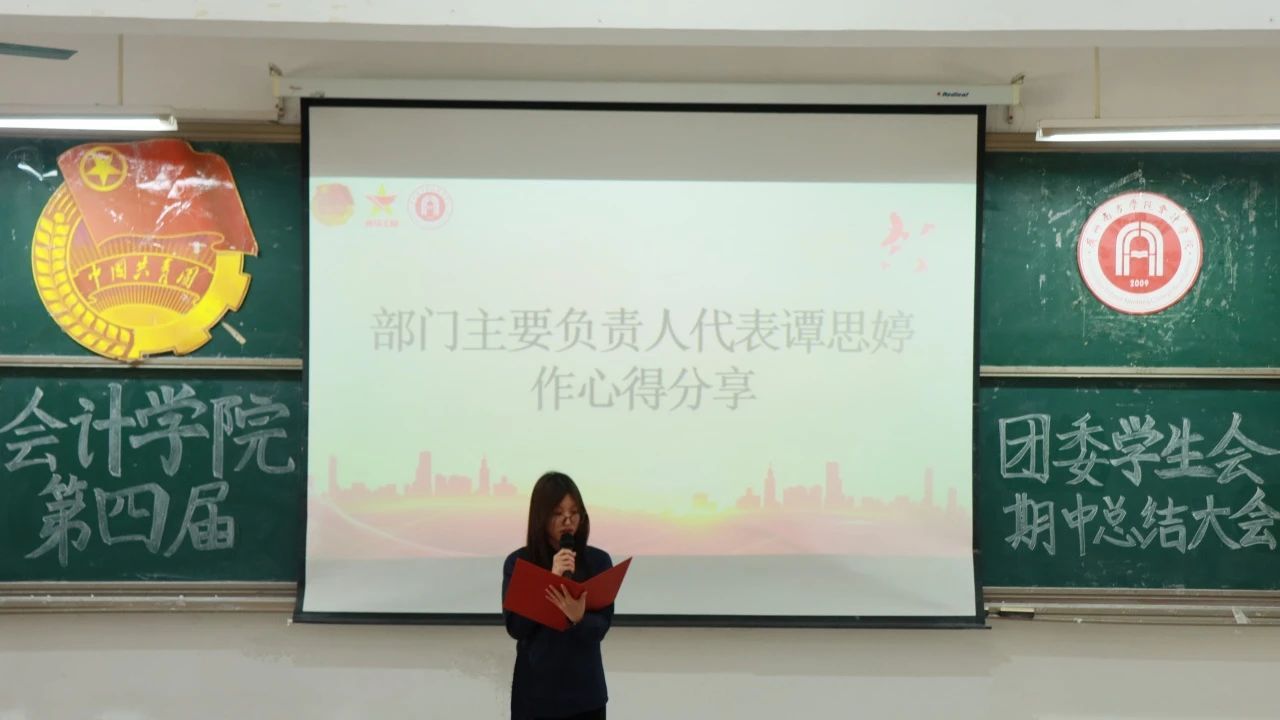 紧接着,纪检部主要负责人范嘉欣同学进行了述职报告。她对一学期以来团学干部队伍的思想、学习、生活和工作作风的监督和考核情况进行通报,以及团学活动开展的公证工作进行汇报。对团学各部门校内活动横幅展板的规范使用情况做出总结。随后,谭思婷同学作为部门主要负责人代表,与大家分享了她这一学期以来工作的的心得体会。她认为团队协作力的加强与成员个人能力的提升是至关重要的,并表达了对秘书处工作持续进步的信心。