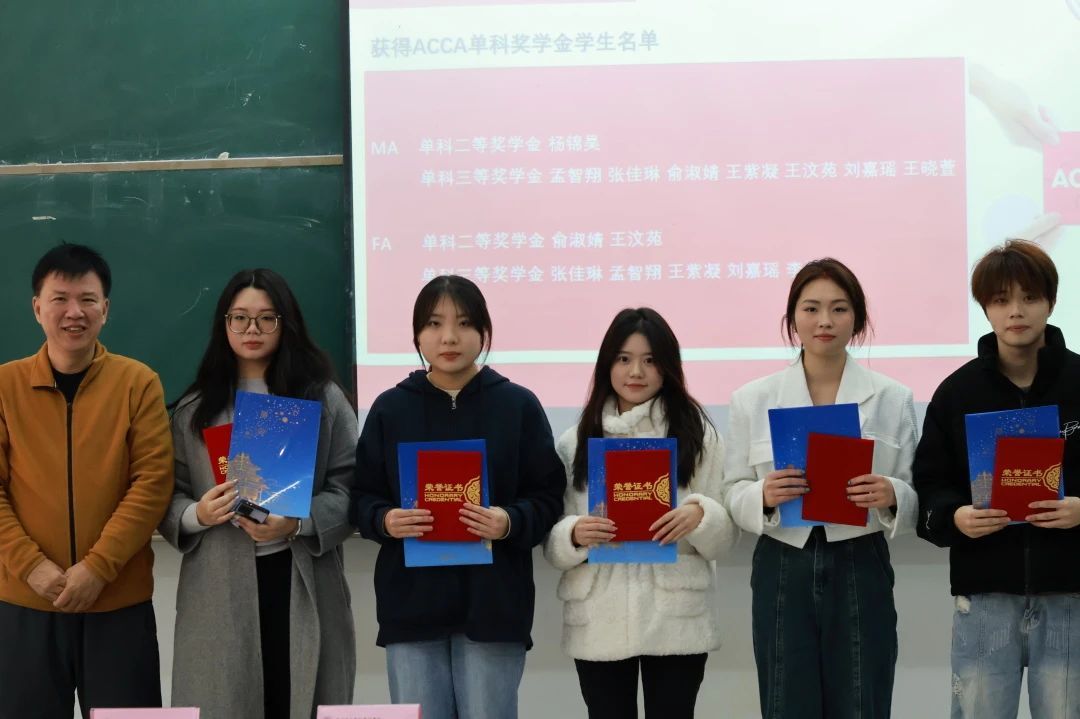 紧接着,秦喆文老师向同学们介绍了ACCA各项奖学金的考核期限与评定标准,逐项宣读获奖名单,老师们为颁发获奖证书和奖品,并合影留念。其中陈芯妍等多位同学屡次上台,收获多项奖学金荣誉,吸引同学们奋发学习,努力向师兄师姐们靠拢。曾涛老师作为教师代表发言,通过讲述ACCA优秀学员的事迹激励在场的同学们要珍惜时光,结合ACCA学习计划做好学业和职业规划,他勉励同学们要全力以赴,争取在未来的全科考试中取得优异成绩。