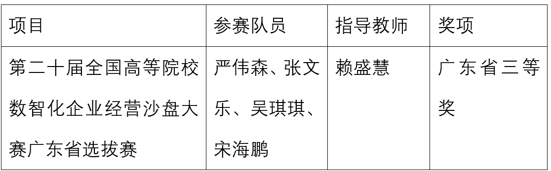 2024年6月29日“第二十届全国高等院校数智化企业经营沙盘大赛广东省选拔赛”在广东理工学院举行,我院赖盛慧老师指导的由21级会计学专业:严伟森、张文乐、吴琪琪、宋海鹏组成的“tyc7111cc太阳成微光队”参加了该项比赛。经过一天激烈的角逐,我院代表队获得了广东省三等奖。
