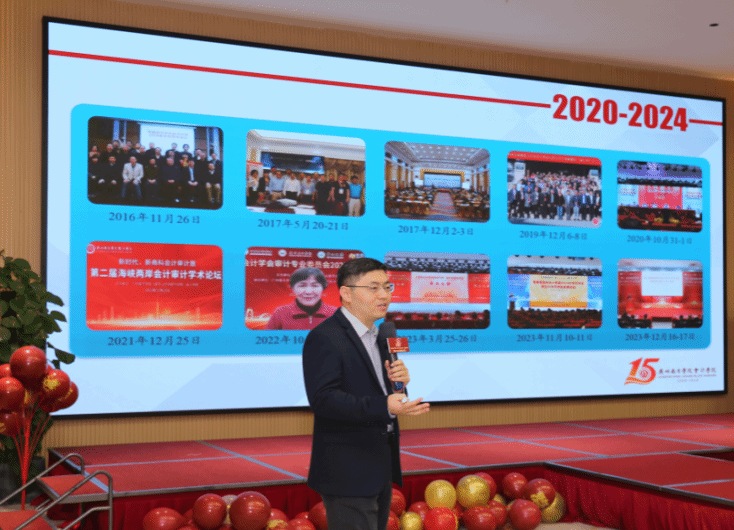 最后,李建超书记发表贺词,对太阳成集团tyc7111十五年的辉煌成就给予肯定,向获得五年、十年、十五年服务贡献奖的教师表示祝贺。他寄语全体教职员工,以十五周年为契机,坚守初心,矢志不渝,深耕专业领域,勇于创新教学科研,携手谱写会计教育事业的壮丽篇章,向着更高目标迈进,为培养卓越会计人才、推动会计学科繁荣贡献智慧与力量。