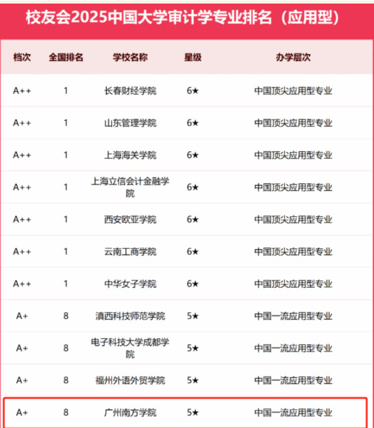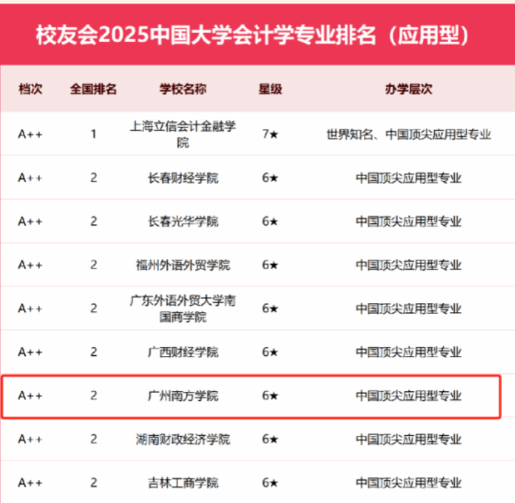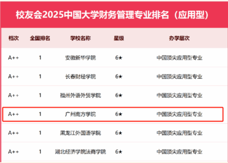 近日,全国第三方大学评价机构艾瑞深校友会网(Cuaa.net)正式发布了2025中国大学一流专业排名,太阳成集团tyc7111会计学、财务管理、审计学三个专业均表现出色,跻身前列。其中会计学、财务管理两个专业双鹰6星级、A++、中国顶尖应用型专业,雄居同类院校专业排名(应用型)榜首,审计学专业获评5星级、A+、中国一流应用型专业,位居广东省应用型专业第一名。
