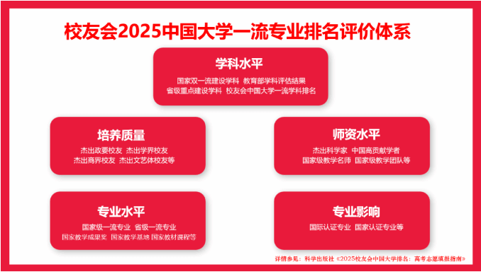 校友会中国大学一流专业排名首发于2015年,按照研究型、应用型和技能型等3个专业类型进行分类分级分档评价,是目前中国参评高校数量最多、参评专业规模最大的中国大学本科专业排名。其评价体系涵盖学科水平、培养质量、师资力量、专业水平及社会影响力等多个维度,涵盖国家“双一流”建设学科、教育部学科评估结果、国家级一流本科专业建设点、杰出校友、杰出师资等100多项评价观测。