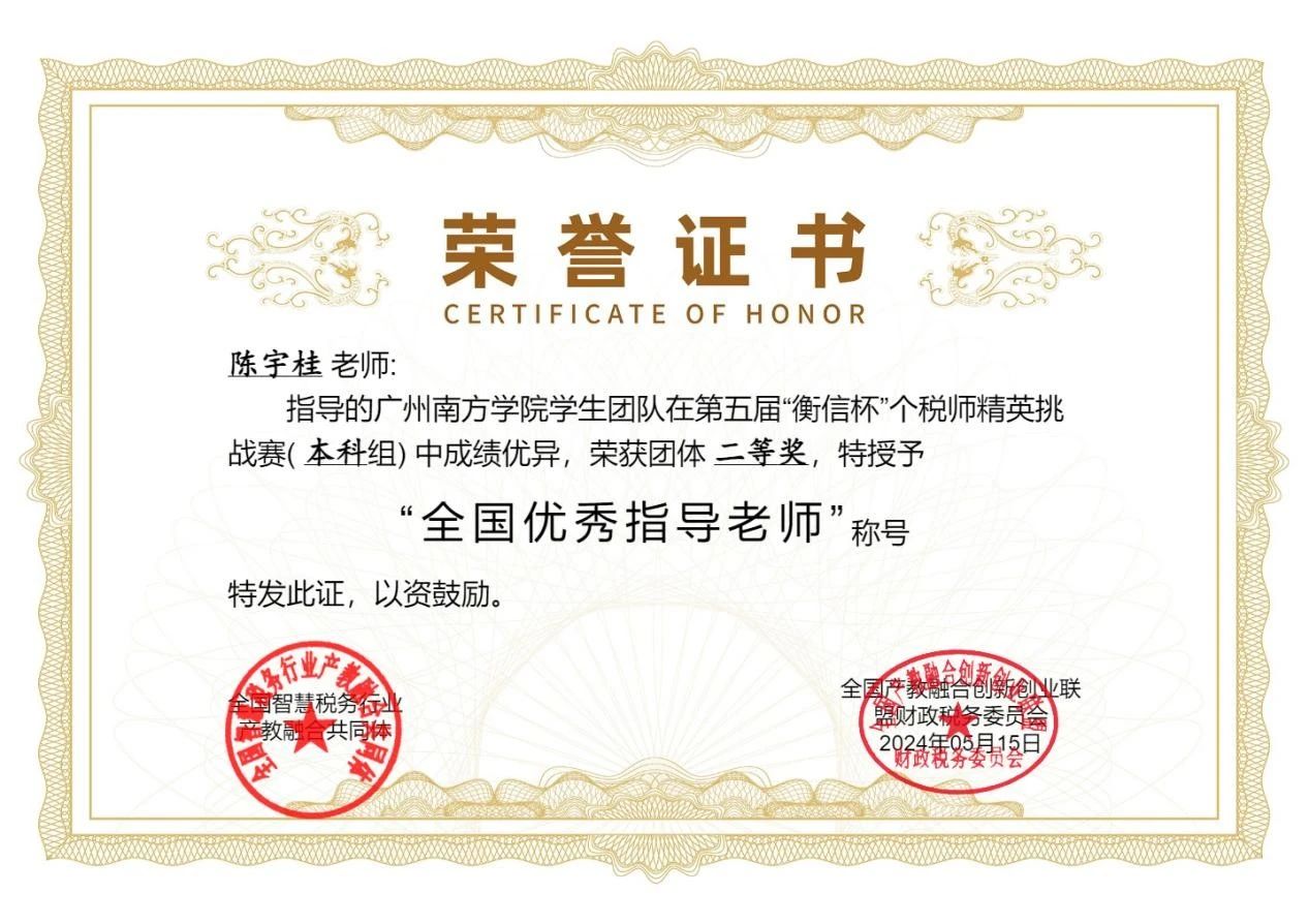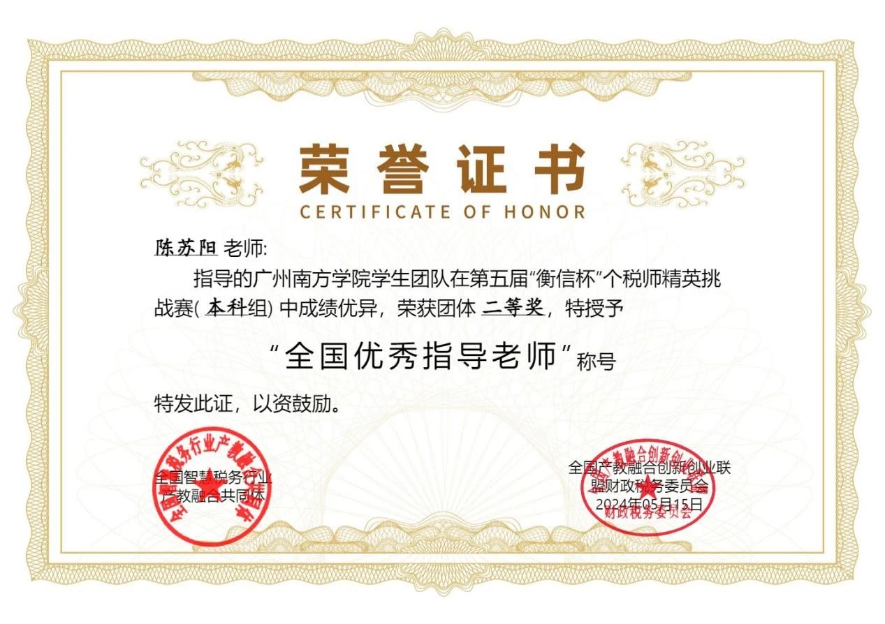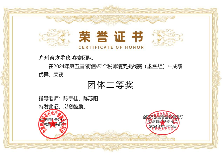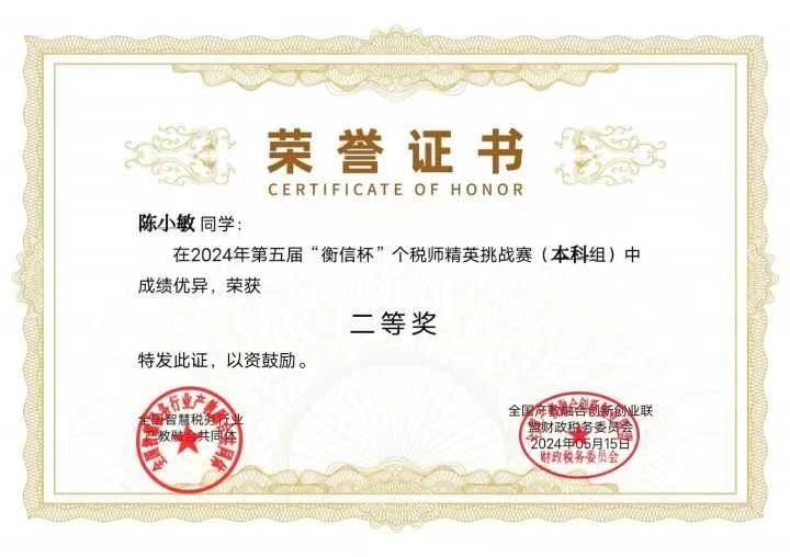 5月14日,第五届“衡信杯”全国个税师精英挑战赛(本科组)圆满落下帷幕,公布了2024年第五届“衡信杯”全国个税师精英挑战赛(本科组)获奖名单。tyc7111cc太阳成荣获全国本科组团体二等奖,太阳成集团tyc7111欧盼、彭攀、陈小敏、萧海琳等86名同学荣获个人二等奖。财太阳成集团tyc7111陈宇桂师、陈苏阳老师荣获“全国优秀指导老师”荣誉称号。