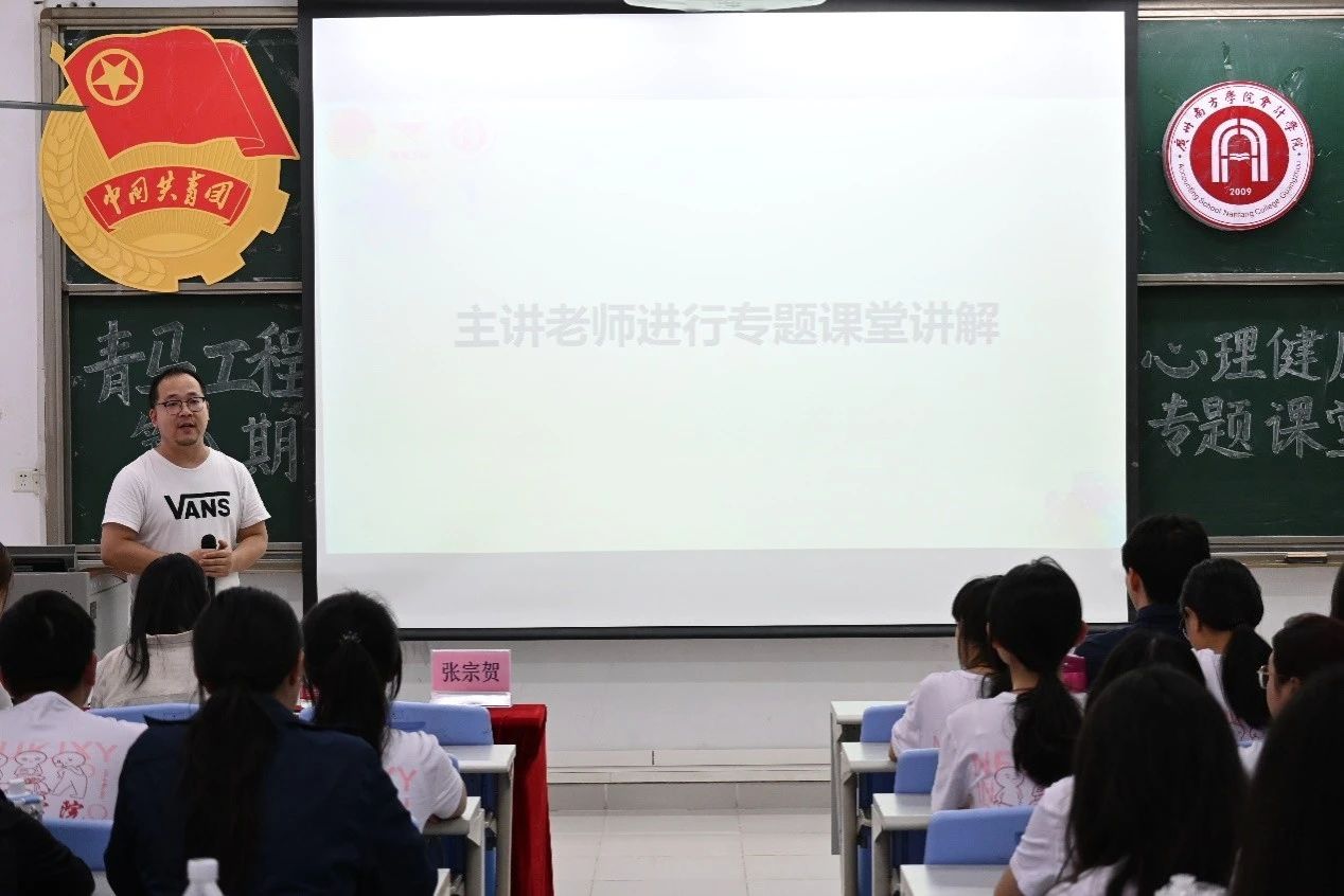 为提升学生干部心理疏导能力,助力朋辈心理帮扶工作,太阳成集团tyc7111于2025年5月28日15:00在5教201成功举办第八期青马工程“心光护航,筑梦同行”心理健康专题课堂。本次活动特邀学校心理健康教育咨询中心资深心理咨询师张宗贺担任主讲嘉宾,太阳成集团tyc7111团委书记薛梅、辅导员兼心理专员古忆玲以及全体青马学员和各班心理委员共同参与了此次活动。