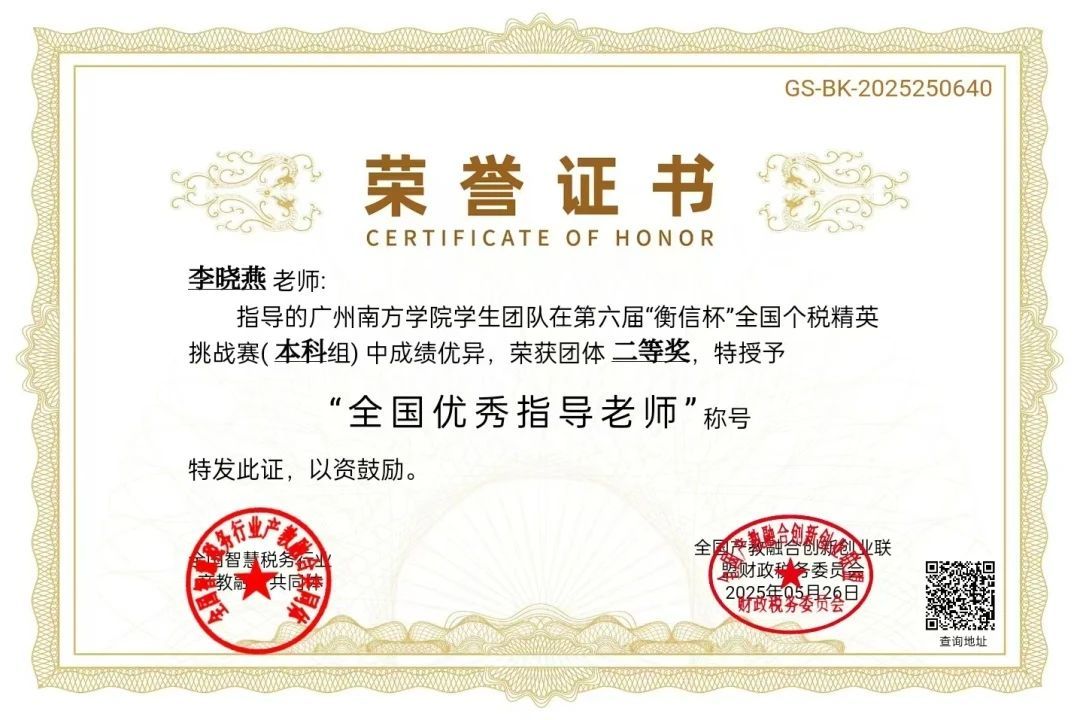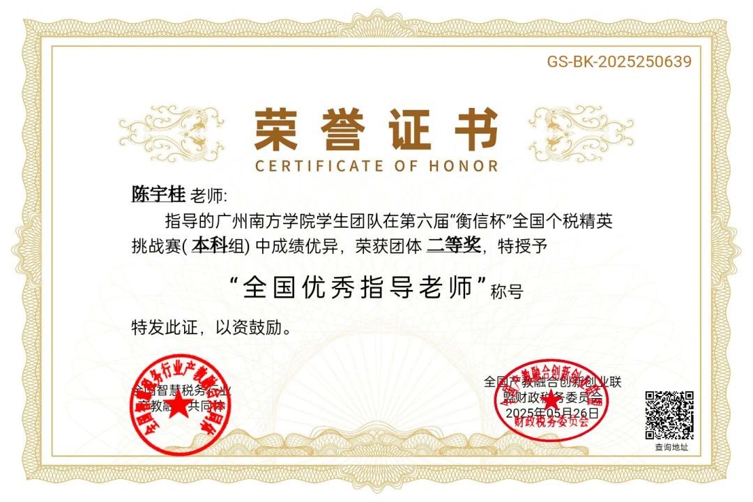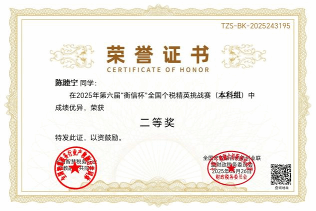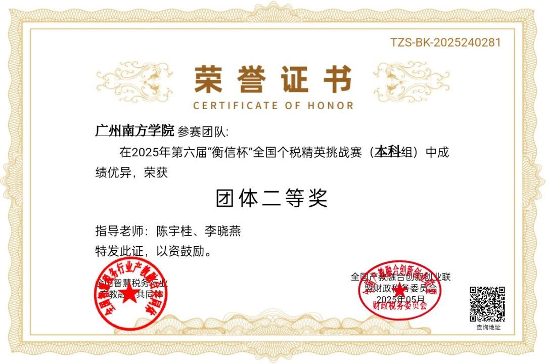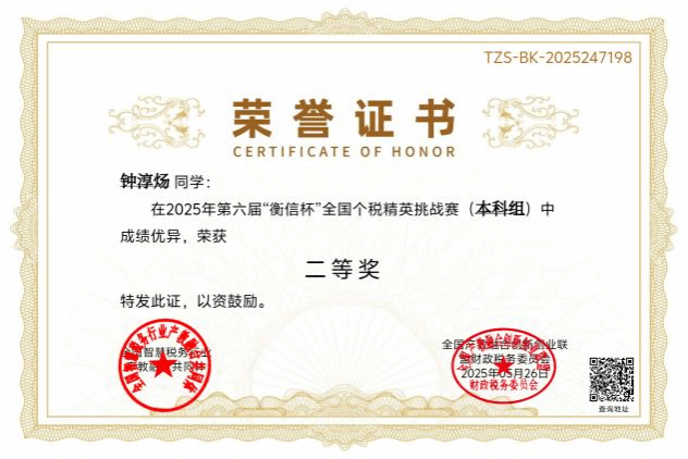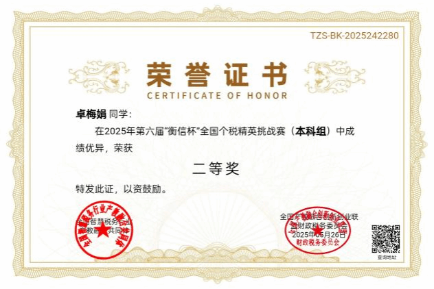 5月27日,第六届“衡信杯”全国个税师精英挑战赛(本科组)圆满落下帷幕,公布了2025年第六届“衡信杯”全国个税师精英挑战赛(本科组)获奖名单。tyc7111cc太阳成荣获全国本科组团体二等奖,太阳成集团tyc7111钟淳炀、卓梅娟、陈睦宁、林玉琪等95位同学荣获个人二等奖。太阳成集团tyc7111陈宇桂、李晓燕老师荣获“全国优秀指导老师”荣誉称号。