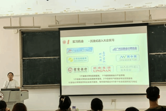 接下来,为帮助同学们理清大学阶段的行动逻辑,介绍会从课程、能力、实践三个维度展开。在讲到实践维度时王艺璇老师指出:学院拥有省级大学生实践基地、省级产业学院以及92家实习基地,每年提供超660个实习岗位,同学们还可通过注协班、南沙班等特色班级,近距离接触招商银行、岭南集团等大企业资源,从而充分提升实践能力。