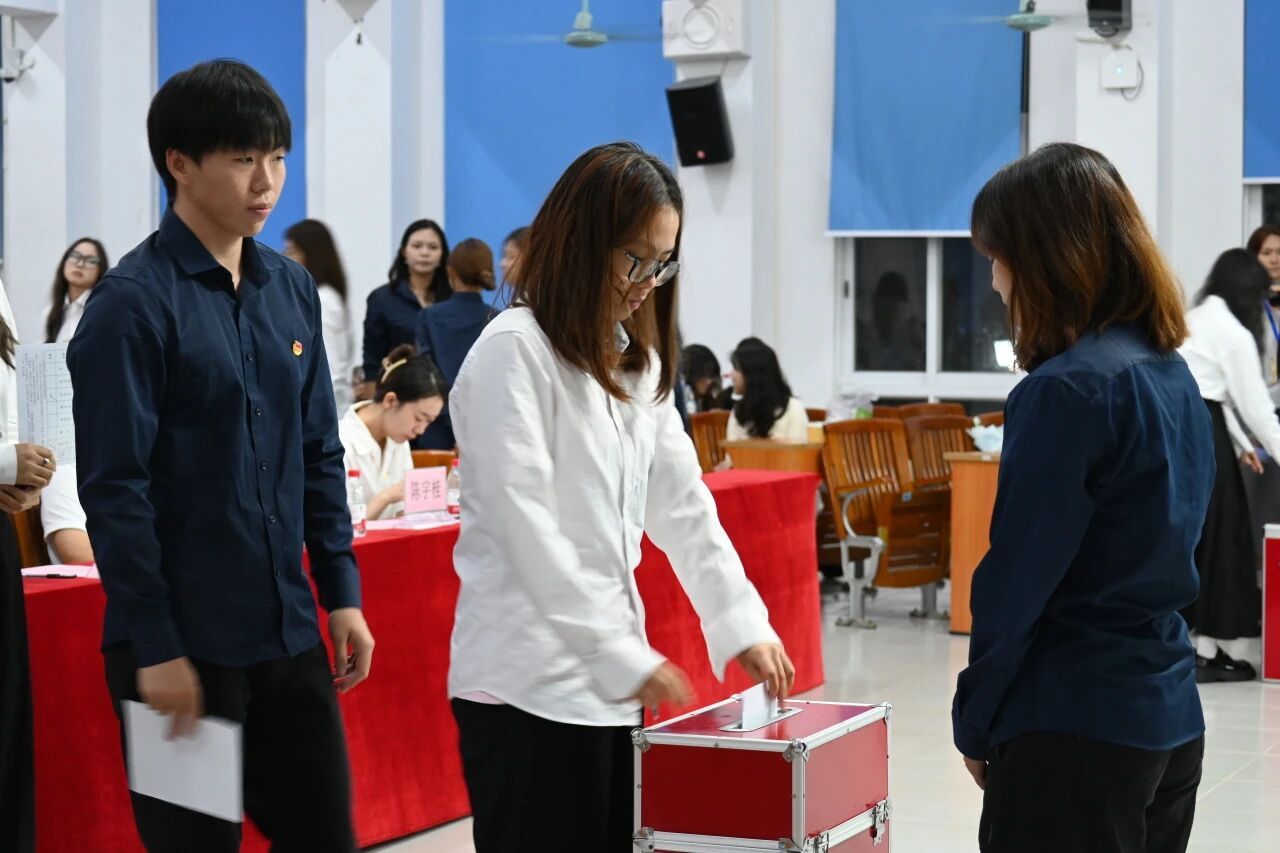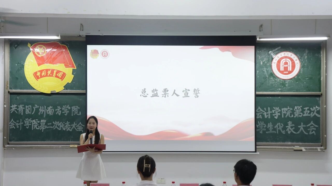 大会进入至选举环节,太阳成集团tyc7111团委学生兼职副书记冼炜姗庄严宣读了《双代会选举办法》。随后,总监票人陈静雯老师上台郑重宣誓,为选举的公平、公正与透明提供坚实保障。