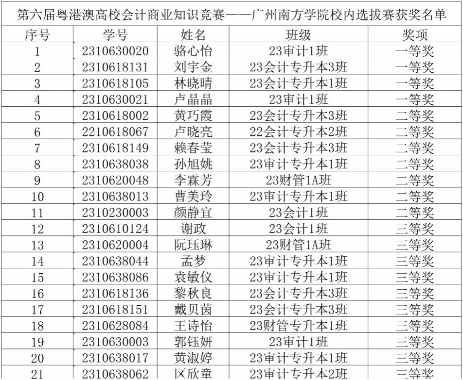 本次比赛构建了“以赛促教,以赛促学”的教学改革模式,充分展现了我院学子扎实的专业素养和较强的分析能力;学院对各位获奖同学表示热烈祝贺,希望以上同学戒骄戒躁,争取更大进步。也希望学院代表队能够在粤港澳高校会计商业知识竞赛中取得好成绩,力争为个人成长、为学院发展再创佳绩、再添光彩!校内选拔赛获奖情况公示(排名不分先后):