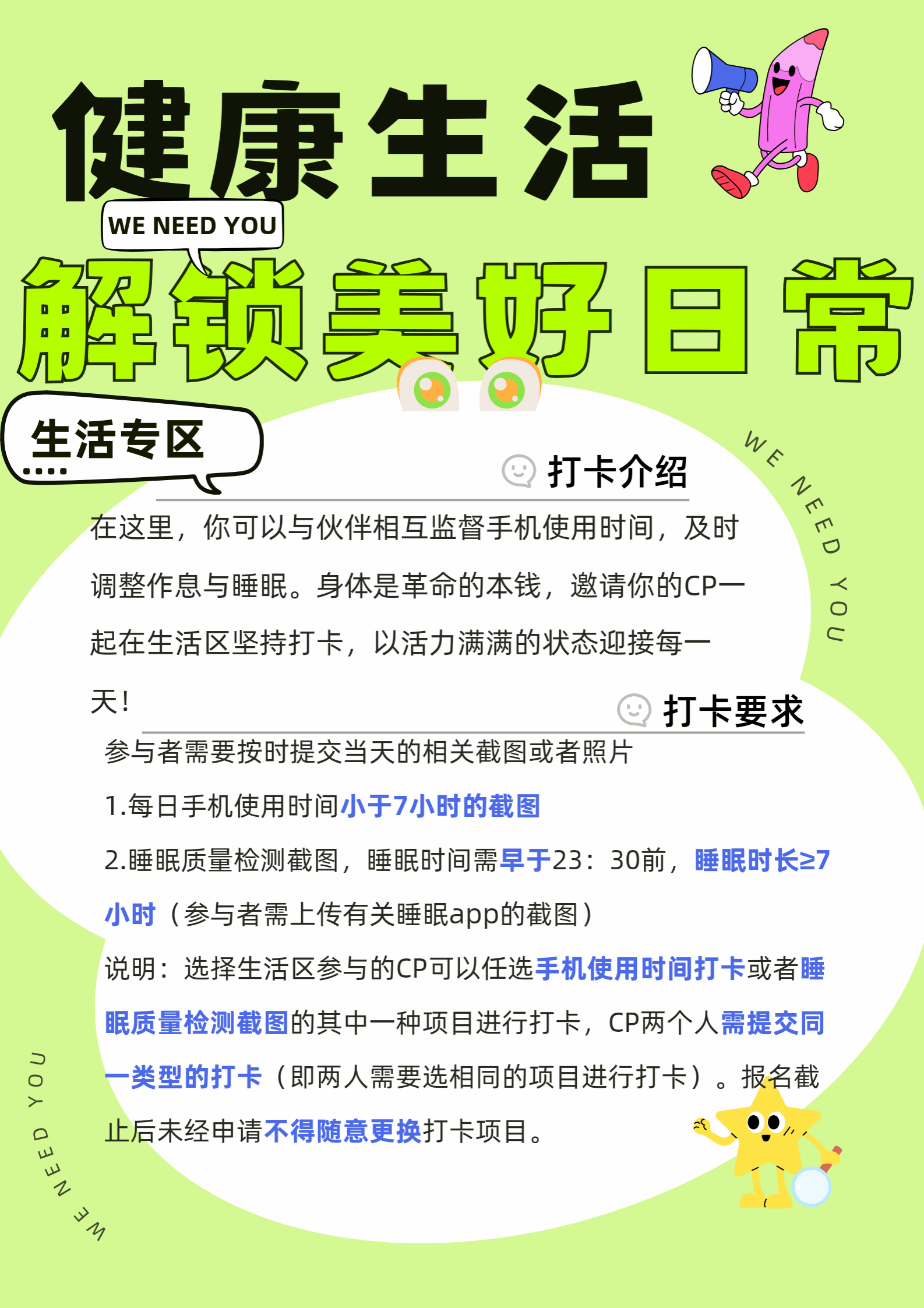 3.本次自律周打卡行动为每7天一个周期,共三个周期。参与活动的CP两个人需要周期内共同完成打卡要求,一个人失败则视本组CP该周期打卡为无效。